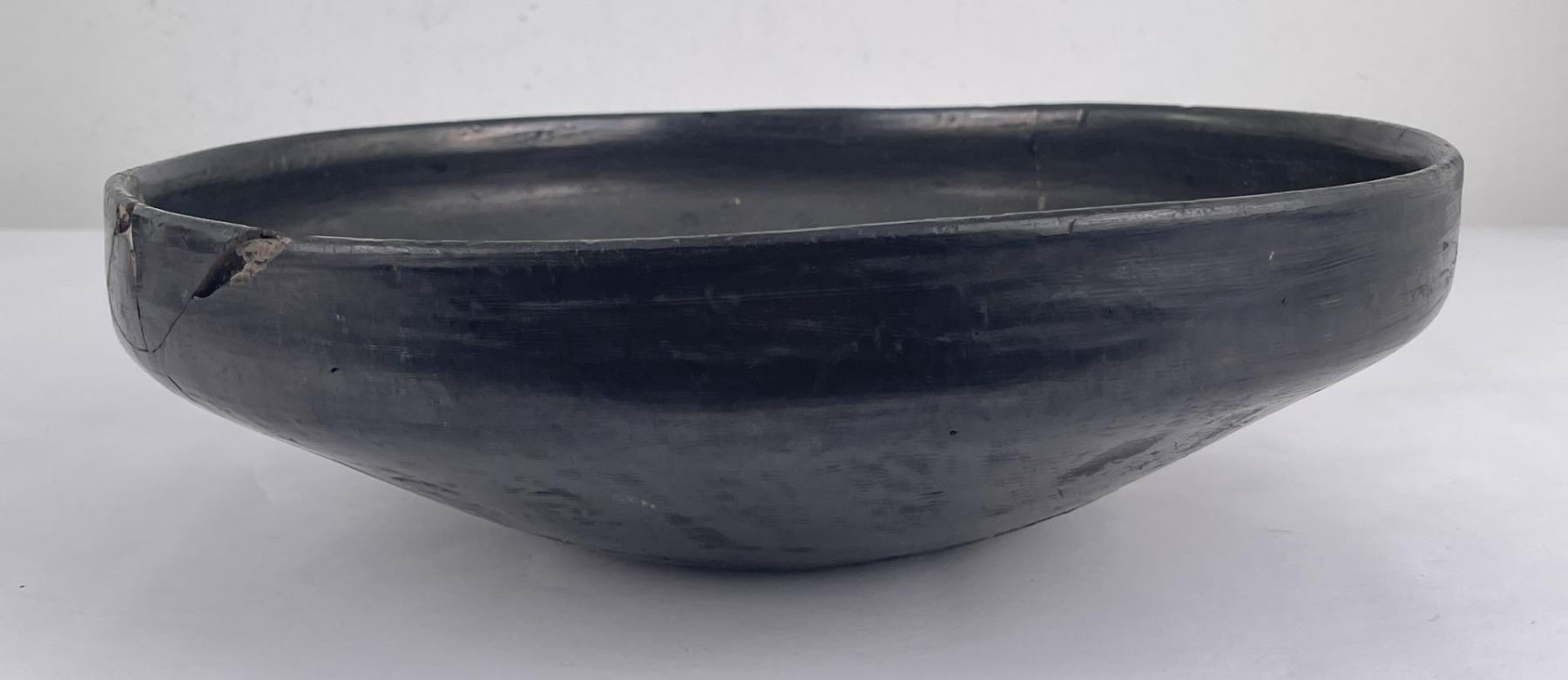 Approximate measurements: 13.5" diameter x 4" tall at rim. Damaged and repaired as shown. Allard Auction Collection Inv: AX