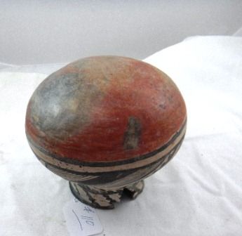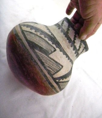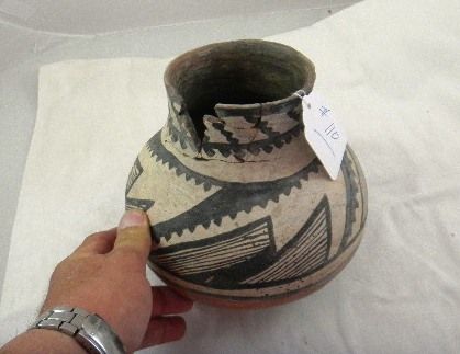 Anasazi Olla three color with neck damage and some pieces missing. Item was found on private land in Arizona. Measuring 8x7 inches. Shipping is $30.00.