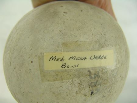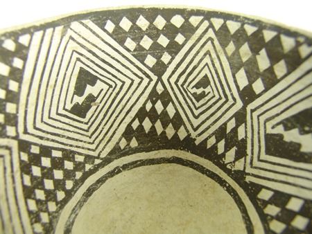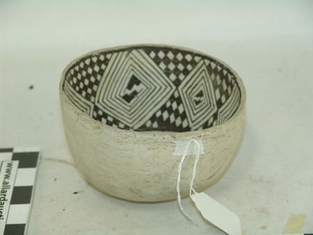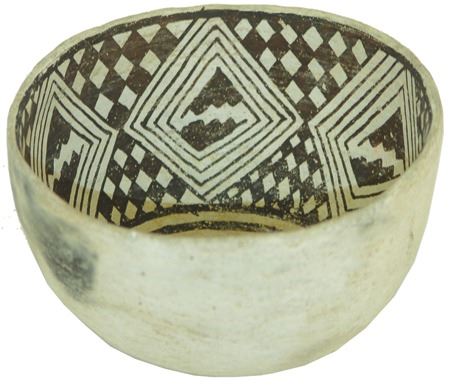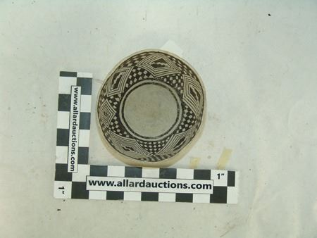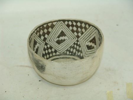 Prehistoric, Beautiful Mesa Verde black-on-white deep bowl with checkered interior design containing large diamond shaped rings. Very good condition, possibly some restoration. 3-1/2" x 5-3/4"