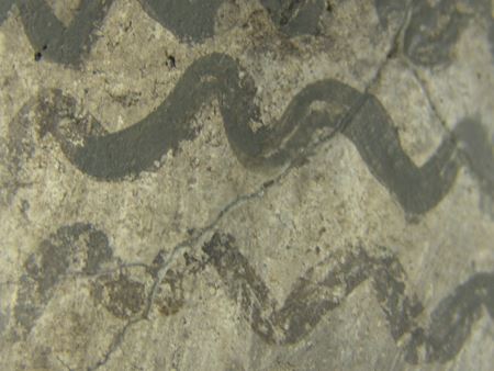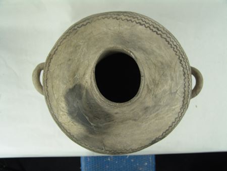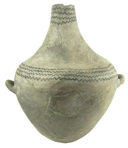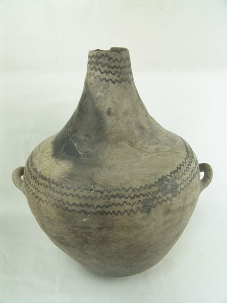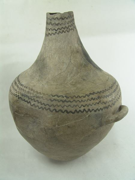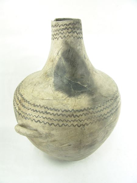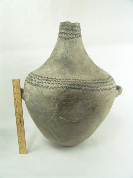 Prehistoric, Huge Mesa Verde black-on-white long-necked pottery jar with rows of interesting wavy lines. Very good condition, professional restoration. 20-1/4" x 17" x 14" PHP