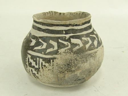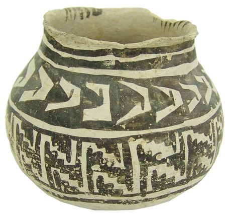 Prehistoric, Small black-on-white wide-mouthed Roosevelt olla with intricate geometric designs. Very good condition, appears to be all original. 3-3/4" x 4-3/4"