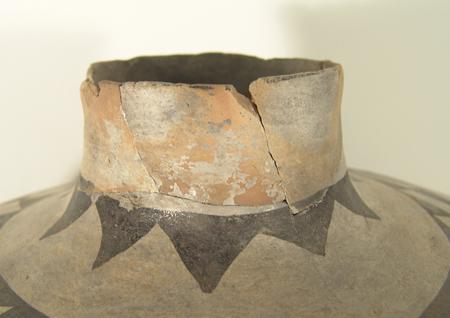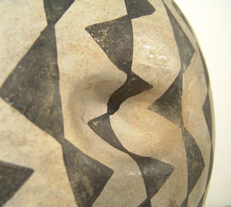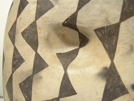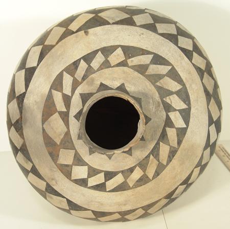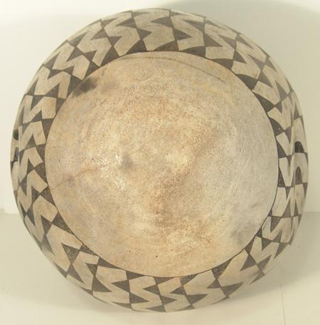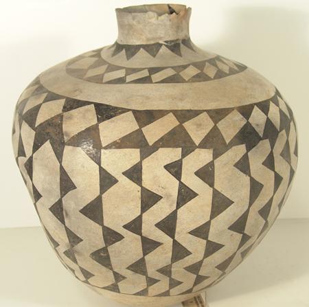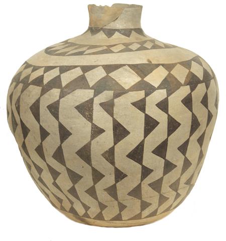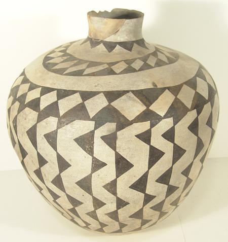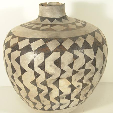 Huge and impressive black-on-white small-necked Chaco Socorro olla with rare finger hold indentations near bottom and bold negative vertical zigzag bands. Purchased in 1962 for $6,000; appraisal value $5,000. 13" high x 13" diameter