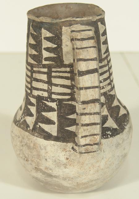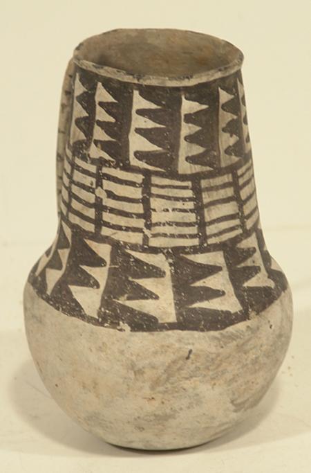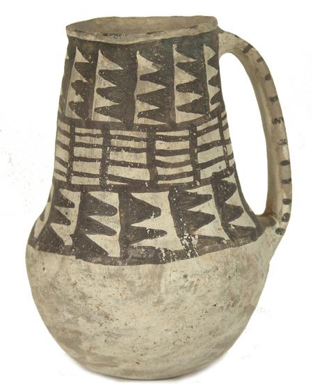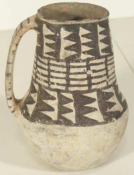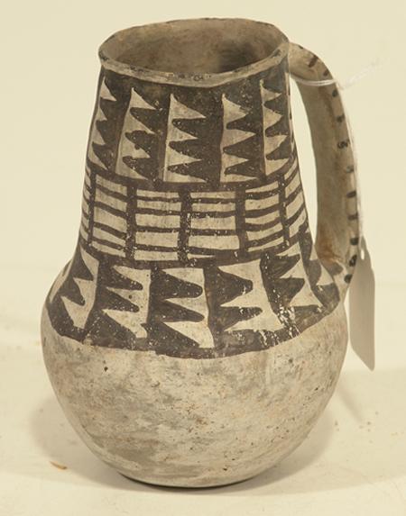 Beautiful black-and-white Chaco pottery pitcher/mug with rectilinear wings and horizontal stripes on handle. Purchased from Ashton in 1975 for $183.75; appraisal value $750. Condition: good, possibly some restoration. 6-1/2" high x 4-1/2" diameter
