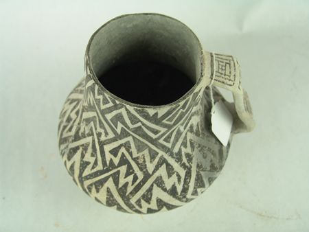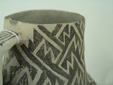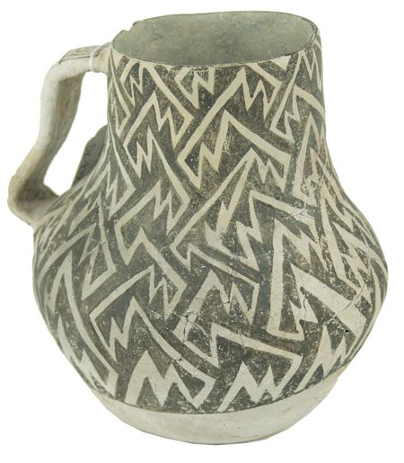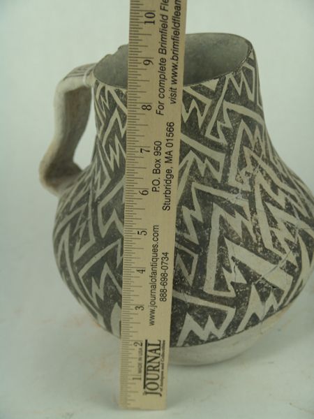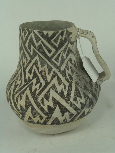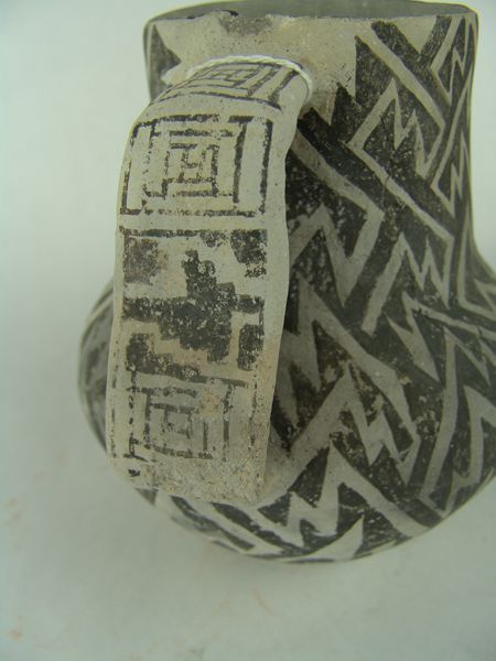 Prehistoric, Rare larger Escavada black-on-white pottery pitcher with jagged exterior design. Very good condition, with professional restoration. 7-3/4" x 7"
