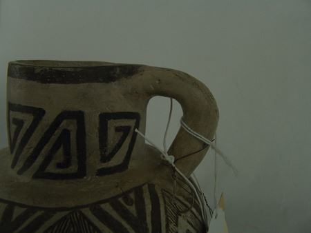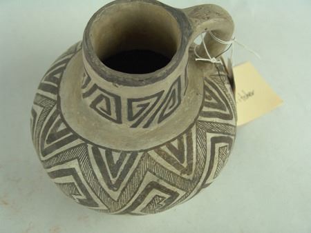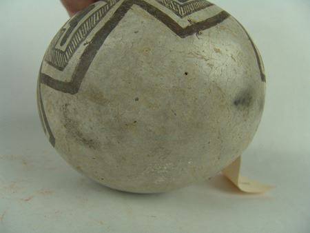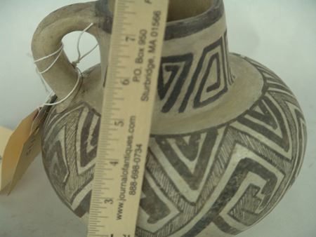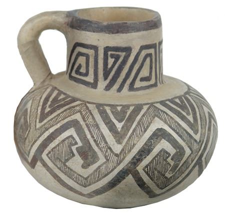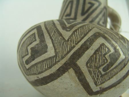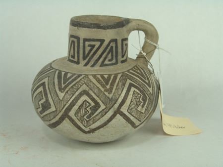 Prehistoric, Classic globular Tularosa black-on-white pitcher with striking bold and fineline geometric designs. Very good condition with some professional restoration. 6-1/2" x 7"