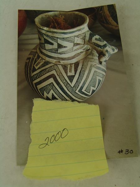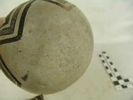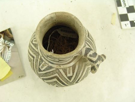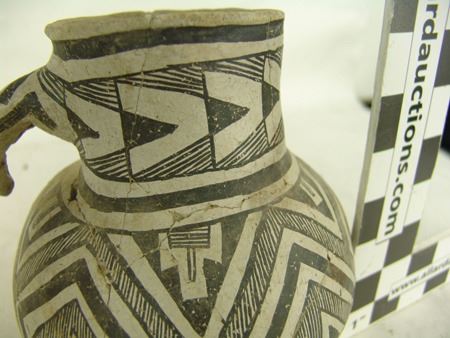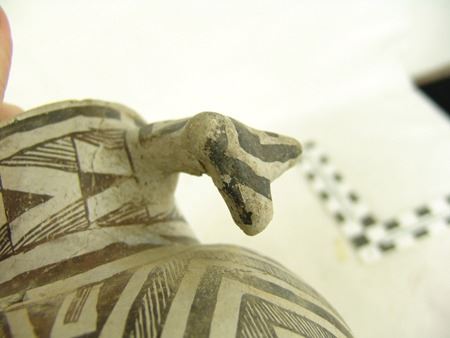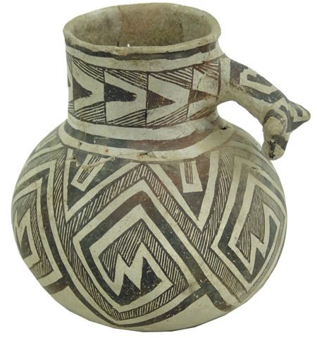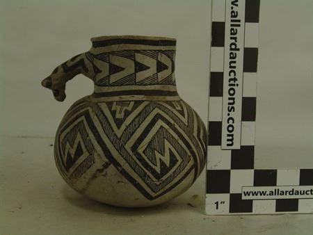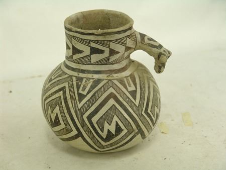 Prehistoric, Rare black-on-white (?) pottery pitcher with animal effigy handle and fineline geometric design. Very good condition, some professional restoration. 8-1/2" x 7-1/2"