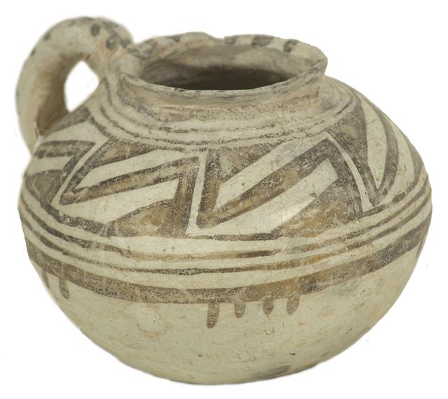 Prehistoric, Rare, small and fine, black-on-white Roosevelt (?) pitcher; minor restoration. 4" x 5-1/2"