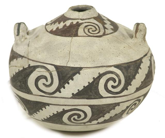 Prehistoric, Unique globular black-on-white Red Mesa canteen with small lugs; professionally restored. 6-1/2" x 7-1/2"