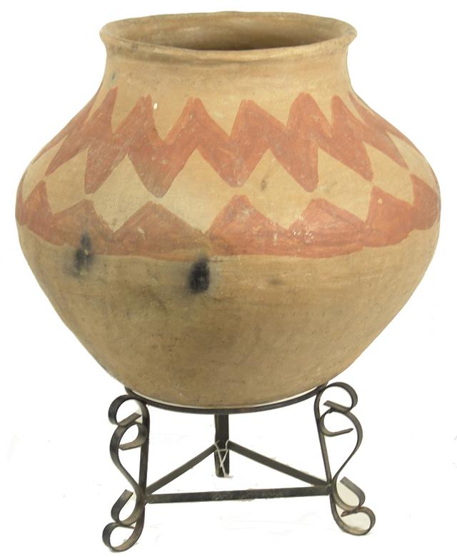Prehistoric, Huge red-on-buff water storage olla with two design bands - includes custom stand. 16-1/2" x 17"