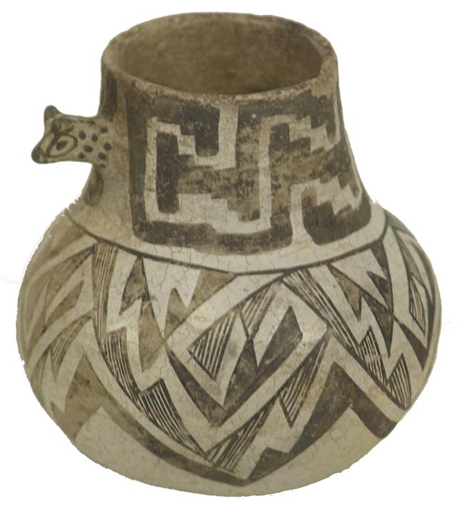 Prehistoric, Rare, small, black-on-white Tularosa dog head effigy pitcher with fineline designs; professionally restored. 6-1/2" x 6"