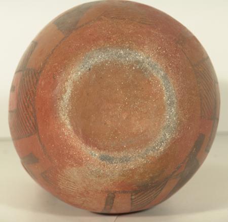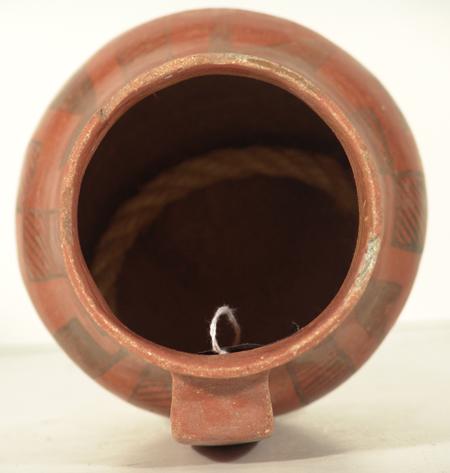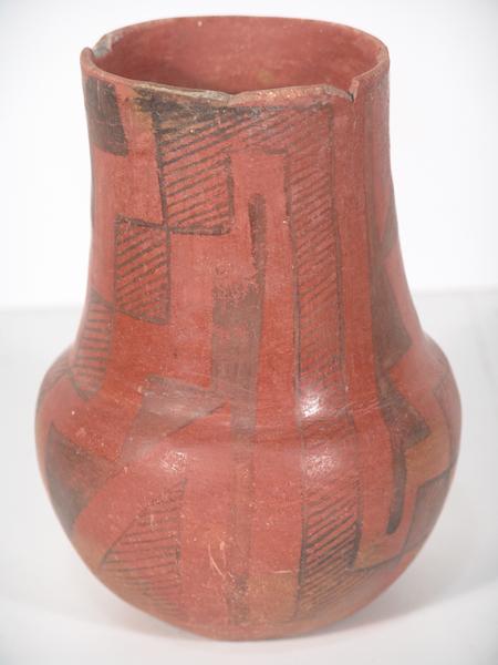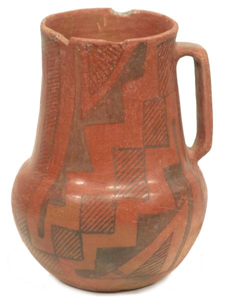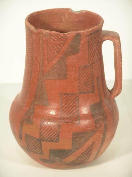 Beautiful, tall black-on-red pitcher with handle and individual rows of fineline squares and black triangles. Appraisal value $1,200. Original condition. 7" x 5-1/2" diameter