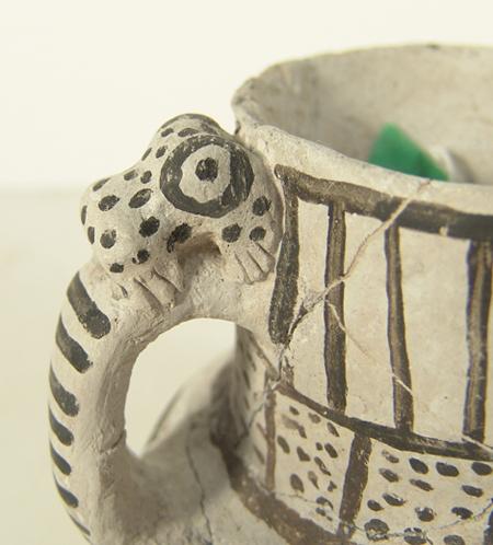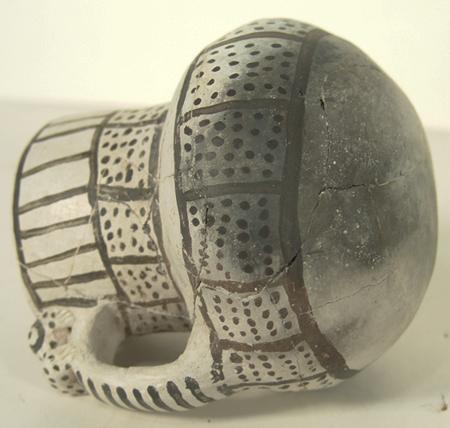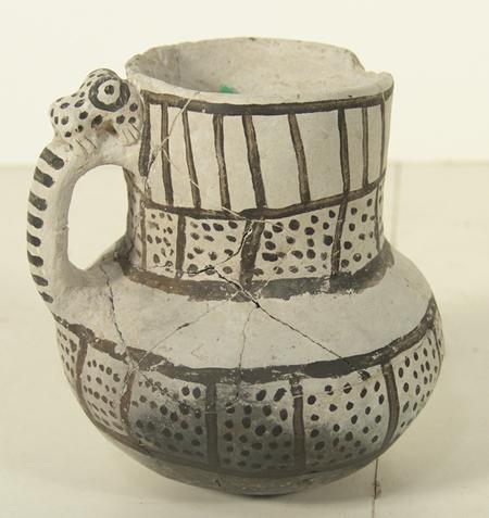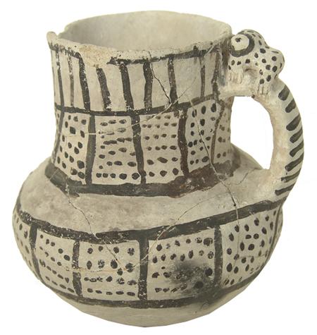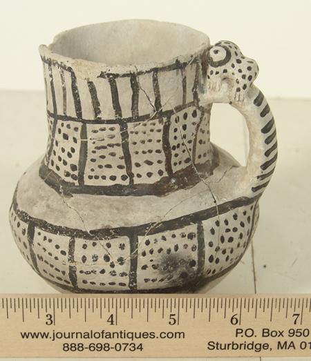 Rare Red Mesa black-on-white pitcher with frog effigy on handle. Professional restoration. 5" x 5"