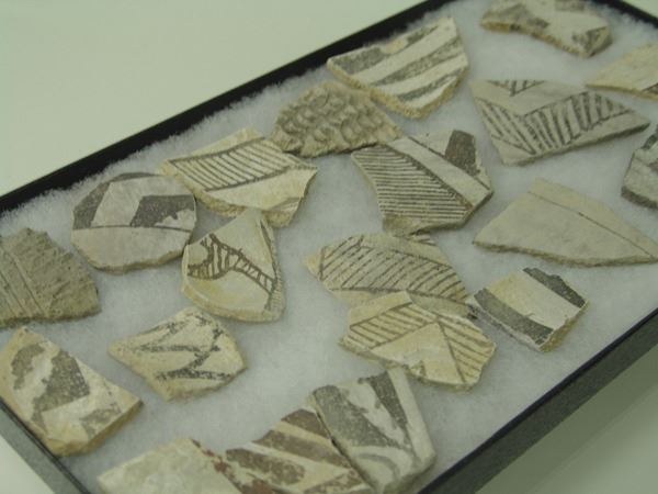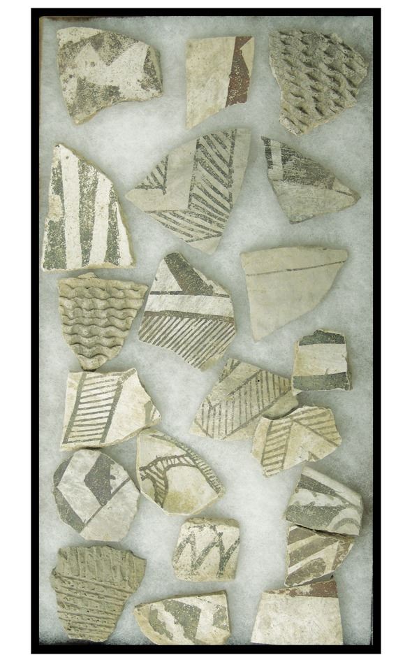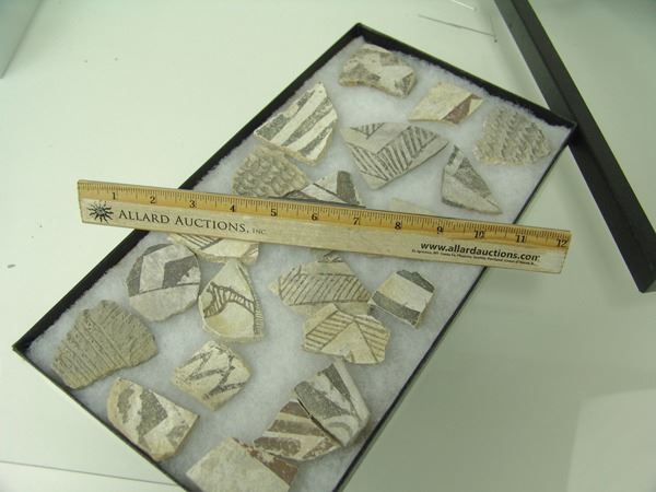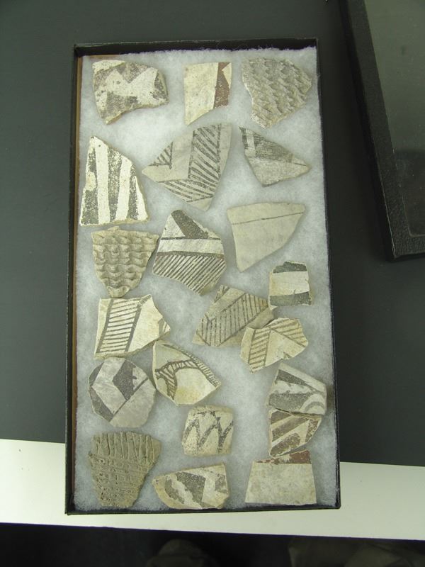 Prehistoric 8" x 15" frame Riker mount display of prehistoric, red-on-white, excavated pieces of pottery. Some very nice examples. Very good condition.