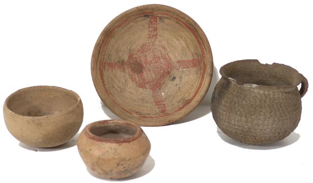 800-1100 A.D., Four Anasazi pottery vessels including a corrugated cup with handle, two painted bowls, and a painted dish; in as-found condition, no restoration. 3-1/2" - 6"