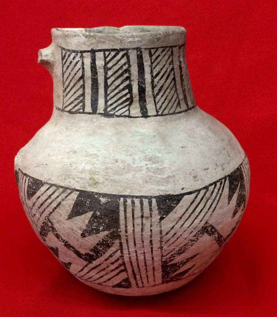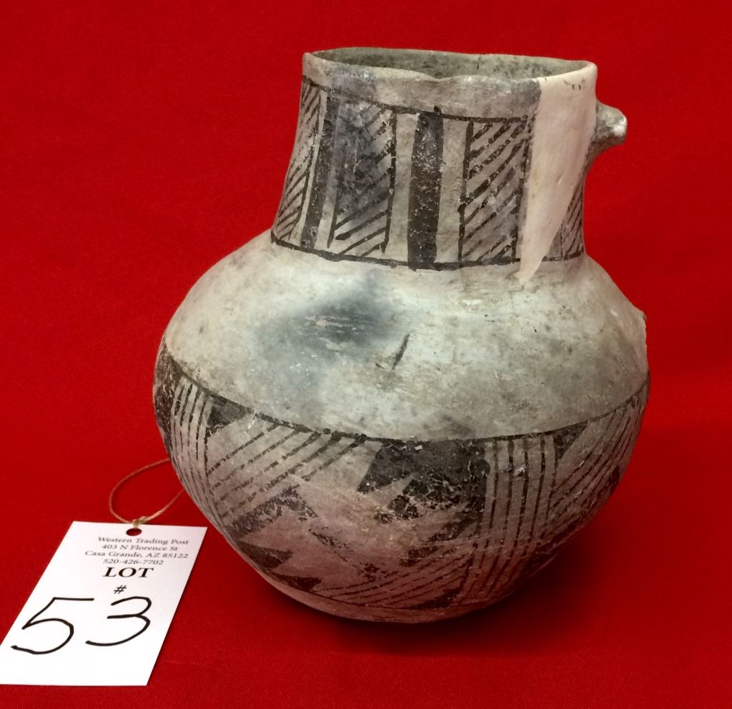 This prehistoric Anasazi pottery vessel (pitcher) measures 7.5” tall and 6.5” wide. It is missing the original handle and has had restoration in the upper portion. Comes with certificate of disclosure signed by seller. In decent condition for its age, but look closely at pics because it has been restored and is not in perfect! Shipping: There will be a $10 handling / packaging fee for shipping this lot. The actual cost of postage will be added on top of that.
