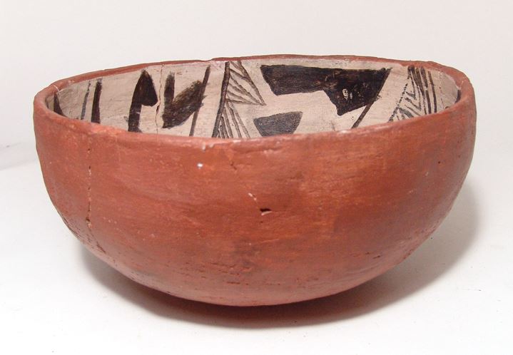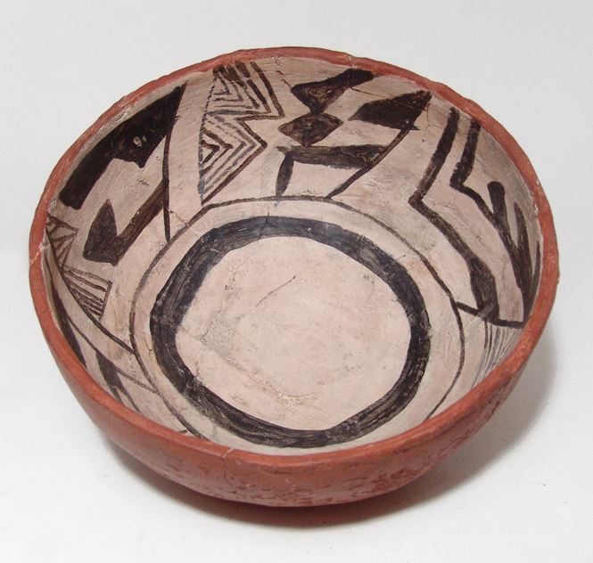 A large Anasazi Salado Polychrome transitional Gila Pinto bowl, American Southwest, c. AD 1300 - 1400, the interior with attractive geometric decoration in dark brown slip against a white ground, the exterior reserved red. 81/4 in x 4 in. Repaired. Ex Dr. John Hilsabeck estate, Orange County.