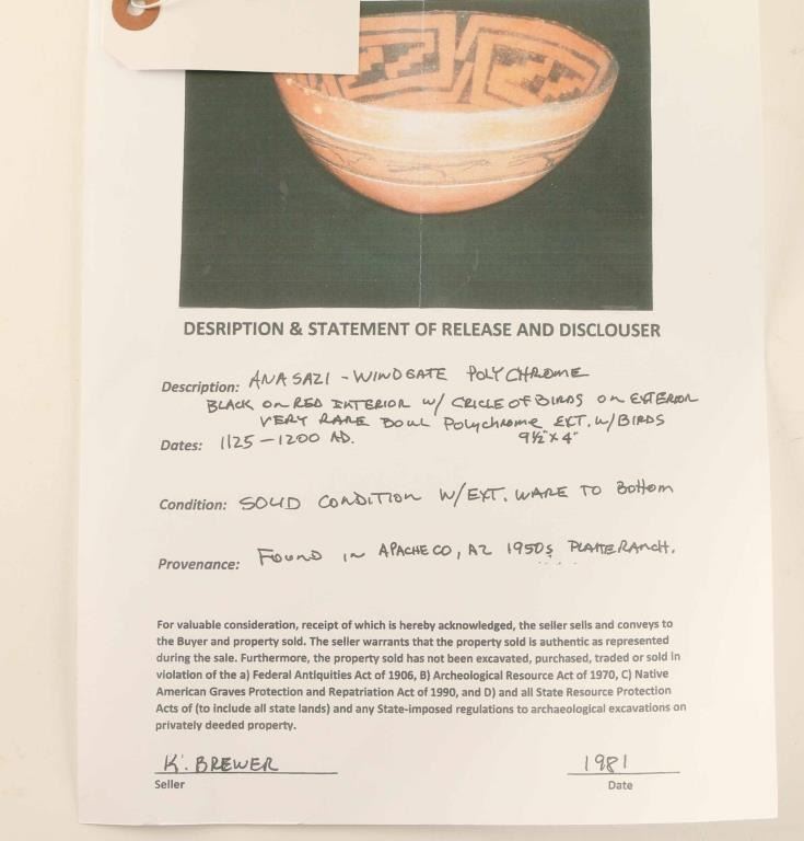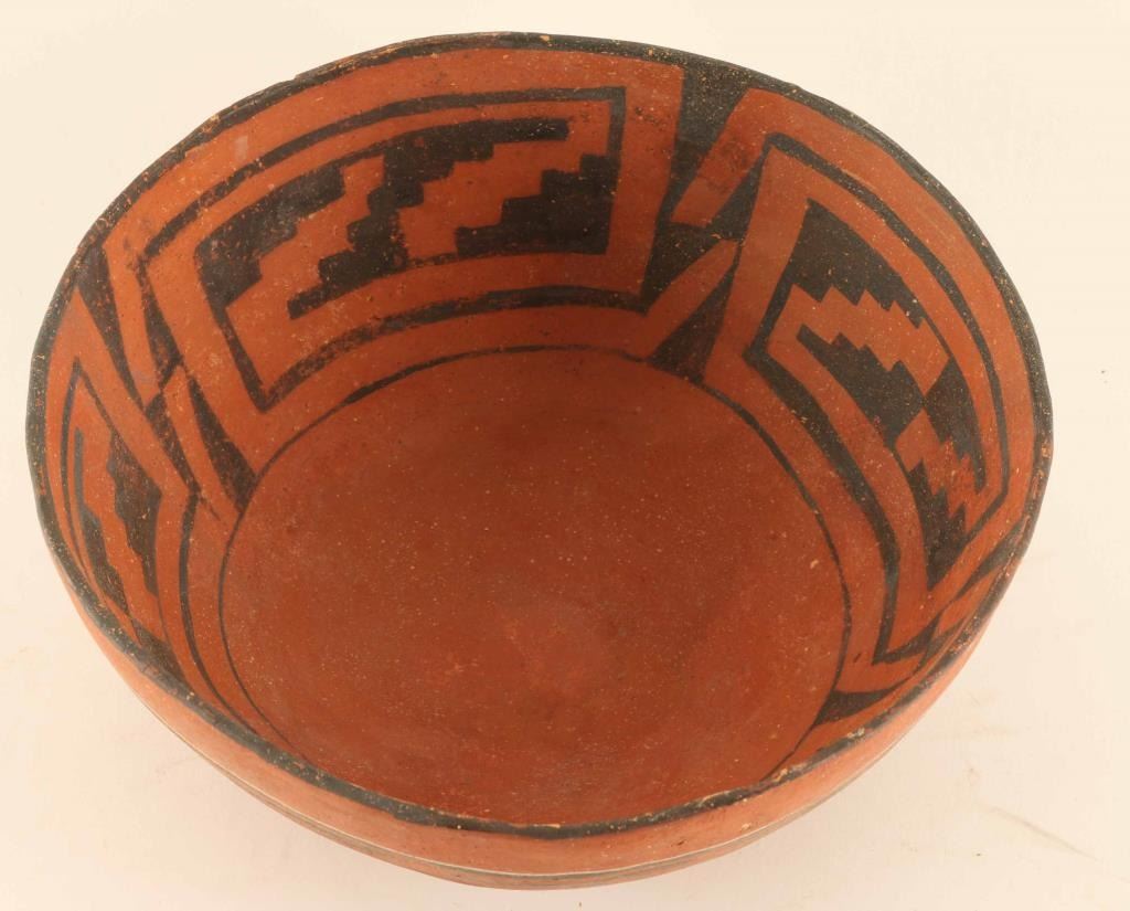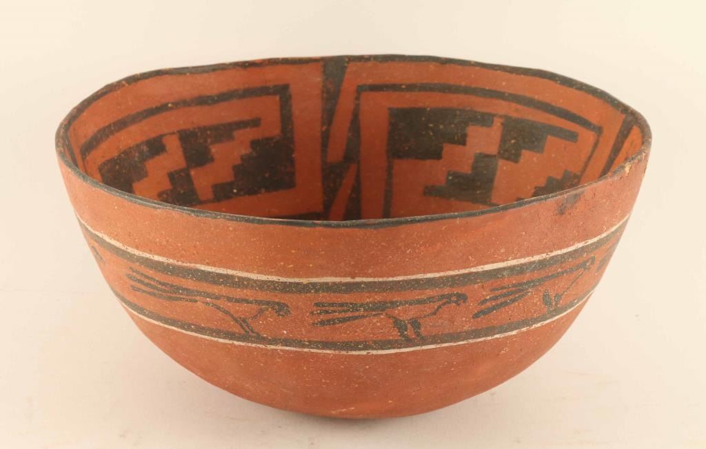 Black on red interior with circle of birds on exterior very rare bowl, 9.5"X4", Solid construction,found in Apache County AZ 1950 Platte Ranch, 1125-1200AD. Includes certificate of authenticity and origin of artifact.