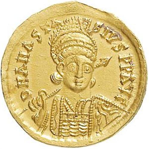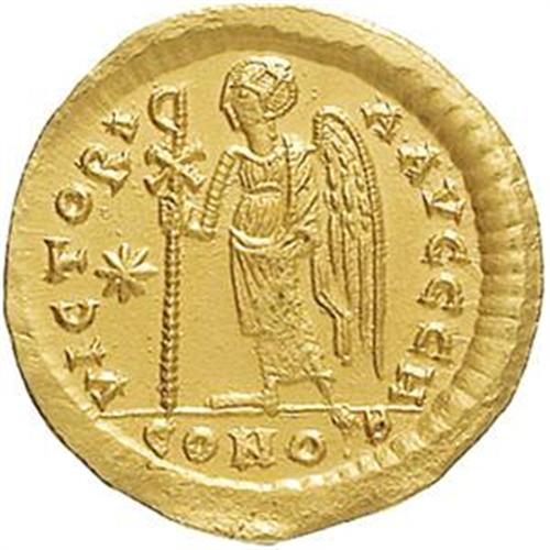 Monete Bizantine. Anastasio I (491-518). Solido, Constantinople. D/ DN ANASTASIVS PP AVG. Busto frontale, elmato e corazzato, con il volto tre quarti a destra, con lancia e scudo. R/ VICTORIA AVCCC H. Vittoria, stante a sinistra, tiene asta sormontata da Cristogramma inverTitus. Nel campo, a sinistra, stella. In esergo: CONOB. D.O. 7h. MIRB 7. Sear 5. gr. 4.49 AU. qSPL/SPL+.