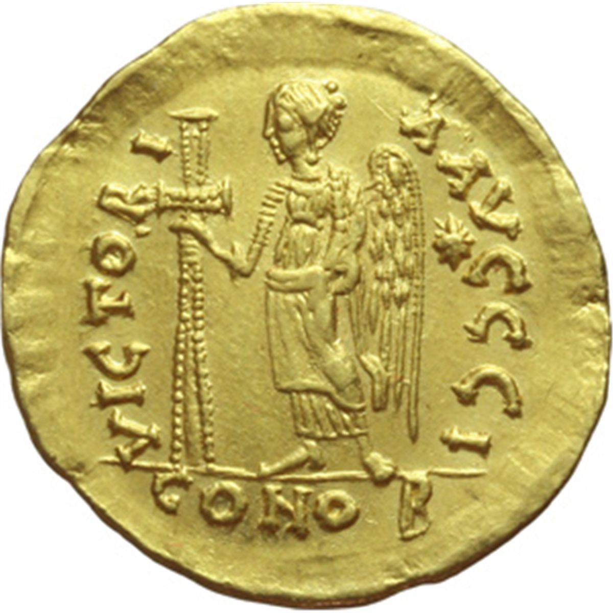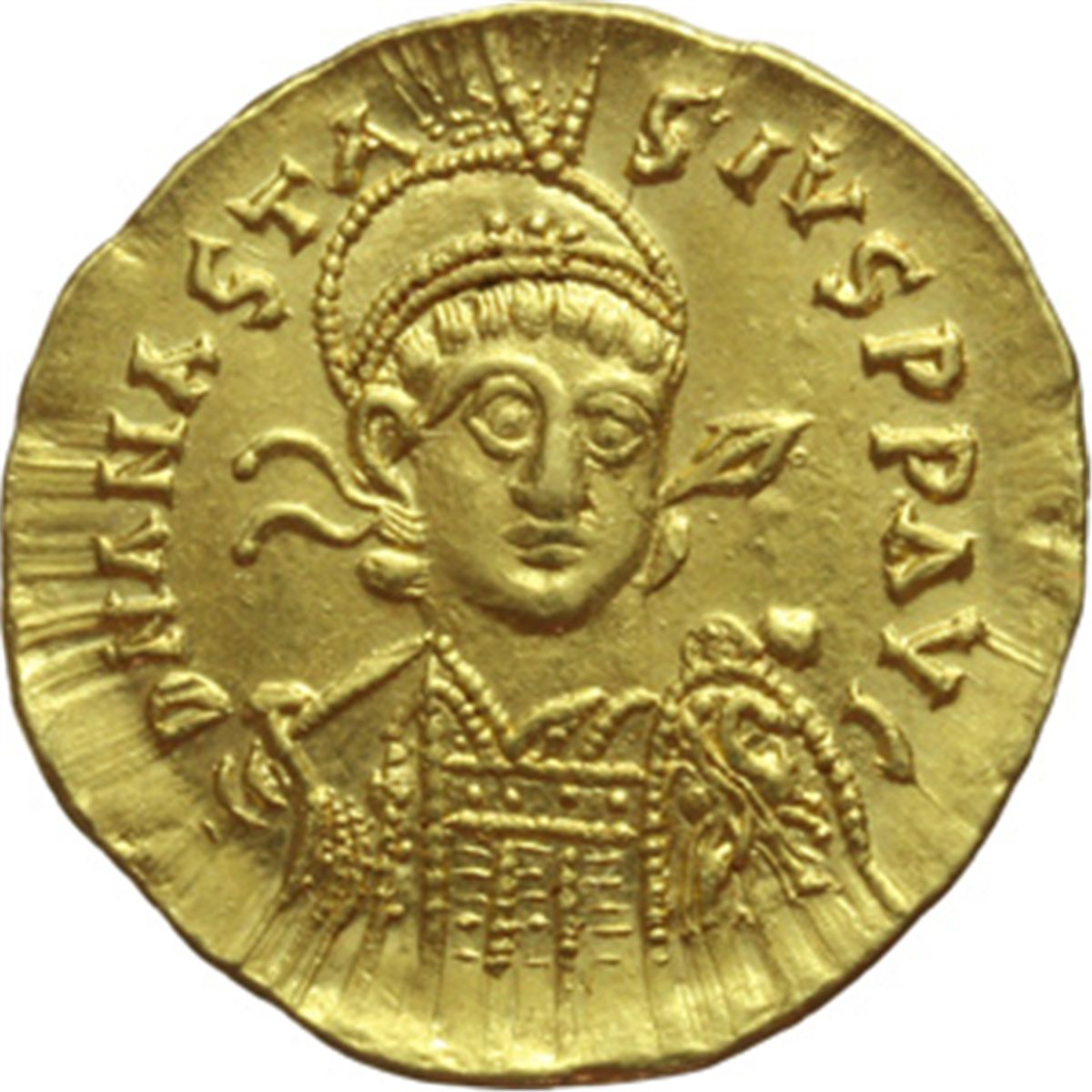 Impero Bizantino. Anastasio I (491-518). Solido, Costantinopoli. D/ DN ANASTASIVS PP AVG. Busto elmato e corazzato di fronte tiene lancia e scudo. R/ VICTORIA AVGGG I. Vittoria, stante a sinistra, tiene lunga croce. A destra, stella. In esergo: CONOB. D.O.3-5. Sear 3. AU. g. 4.39 mm. 21.00 Di grande qualitv†. SPL.