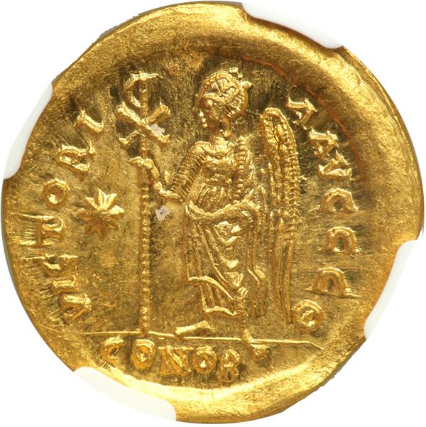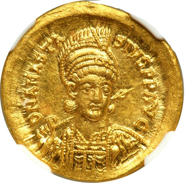 Anastasius I, 491-518. Gold Solidus (4.47 gr). Constantinople. Helmeted bust ¾ facing r., spear behind head. Reverse: Victory standing left holding staff topped with reversed Chi-Rho. D.O. 6b; S. 4. Well struck with wide margins and full legends. NGC graded Mint State; Strike: 5/5, Surface: 4/5.