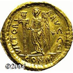<B>Anastasius I.</B></I> A.D. 491-518. AV solidus (21 mm, 4.37 g). Constantinople, A.D. 491-498. Helmeted and cuirassed bust facing slightly right, holding spear over shoulder and shield decorated with horseman spearing a fallen enemy; helmet decorated with a trefoil ornament / Victory standing left, holding long voided cross; star in right field; I/CONOB. DOC 3i; SB 3. Near XF. <BR><I>From the Geneva Collection.</B></I> <BR><BR><B>Important notice:</B> Heritage usually auctions material at the rate of 200-250 lots per hour. On some occasions eBay Live bid software or the Internet may not be able to keep up with the pace of the auction. We recommend placing a realistic absentee bid now as insurance to avoid disappointment. Occasionally the auctioneer may eliminate or reject an eBay Live bid, and the auctioneer may also reopen a lot after the close of the eBay live bidding (usually because we missed an audience bid), and may reject your bid even if it shows you as the winning bidder. By bidding via eBay Live, you agree that Heritage may award the lot to another bidder at its sole discretion under the circumstances described above or any other reasonable circumstances. Since eBay bids are not shown to us until we open the lot on the floor, we treat those bids just like floor bids. In most cases the floor responds before the eBay bid is presented to us, due to Internet lag time, so for consistency we have made it a policy that floor bids are always considered first over tie eBay live bids. Also please note that all Heritage lots purchased through eBay Live carry a 20% Buyer's Premium. Please make sure you read the Terms and Conditions before you bid.