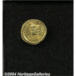 <B>Anastasius I.</B></I> A.D. 491-518. AV solidus (21 mm, 4.37 g). Constantinople, A.D. 491-498. Helmeted and cuirassed bust facing slightly right, holding spear over shoulder and shield decorated with horseman spearing a fallen enemy; helmet decorated with a trefoil ornament / Victory standing left, holding long voided cross; star in right field; I/CONOB. DOC 3i; SB 3. Near XF. <BR><I>From the Geneva Collection.</B></I> <BR><BR><B>Important notice:</B> Heritage usually auctions material at the rate of 200-250 lots per hour. On some occasions eBay Live bid software or the Internet may not be able to keep up with the pace of the auction. We recommend placing a realistic absentee bid now as insurance to avoid disappointment. Occasionally the auctioneer may eliminate or reject an eBay Live bid, and the auctioneer may also reopen a lot after the close of the eBay live bidding (usually because we missed an audience bid), and may reject your bid even if it shows you as the winning bidder. By bidding via eBay Live, you agree that Heritage may award the lot to another bidder at its sole discretion under the circumstances described above or any other reasonable circumstances. Since eBay bids are not shown to us until we open the lot on the floor, we treat those bids just like floor bids. In most cases the floor responds before the eBay bid is presented to us, due to Internet lag time, so for consistency we have made it a policy that floor bids are always considered first over tie eBay live bids. Also please note that all Heritage lots purchased through eBay Live carry a 20% Buyer's Premium. Please make sure you read the Terms and Conditions before you bid.