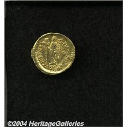 <B>Anastasius I.</B></I> A.D. 491-518. AV solidus (21 mm, 4.37 g). Constantinople, A.D. 491-498. Helmeted and cuirassed bust facing slightly right, holding spear over shoulder and shield decorated with horseman spearing a fallen enemy; helmet decorated with a trefoil ornament / Victory standing left, holding long voided cross; star in right field; I/CONOB. DOC 3i; SB 3. Near XF. <BR><I>From the Geneva Collection.</B></I> <BR><BR><B>Important notice:</B> Heritage usually auctions material at the rate of 200-250 lots per hour. On some occasions eBay Live bid software or the Internet may not be able to keep up with the pace of the auction. We recommend placing a realistic absentee bid now as insurance to avoid disappointment. Occasionally the auctioneer may eliminate or reject an eBay Live bid, and the auctioneer may also reopen a lot after the close of the eBay live bidding (usually because we missed an audience bid), and may reject your bid even if it shows you as the winning bidder. By bidding via eBay Live, you agree that Heritage may award the lot to another bidder at its sole discretion under the circumstances described above or any other reasonable circumstances. Since eBay bids are not shown to us until we open the lot on the floor, we treat those bids just like floor bids. In most cases the floor responds before the eBay bid is presented to us, due to Internet lag time, so for consistency we have made it a policy that floor bids are always considered first over tie eBay live bids. Also please note that all Heritage lots purchased through eBay Live carry a 20% Buyer's Premium. Please make sure you read the Terms and Conditions before you bid.