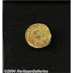 <B>Anastasius I.</B></I> A.D. 491-518. AV solidus (21 mm, 4.42 g). Constantinople, A.D. 491-498. Helmeted and cuirassed bust facing slightly right, holding spear over shoulder and shield decorated with horseman spearing a fallen enemy; helmet decorated with a small cross / Victory standing left, holding long voided cross; star in right field; (Delta)/CONOB. DOC 4 var. (officina not listed); SB 3. Near VF. <BR><I>From the Geneva Collection.</B></I> <BR><BR><B>Important notice:</B> Heritage usually auctions material at the rate of 200-250 lots per hour. On some occasions eBay Live bid software or the Internet may not be able to keep up with the pace of the auction. We recommend placing a realistic absentee bid now as insurance to avoid disappointment. Occasionally the auctioneer may eliminate or reject an eBay Live bid, and the auctioneer may also reopen a lot after the close of the eBay live bidding (usually because we missed an audience bid), and may reject your bid even if it shows you as the winning bidder. By bidding via eBay Live, you agree that Heritage may award the lot to another bidder at its sole discretion under the circumstances described above or any other reasonable circumstances. Since eBay bids are not shown to us until we open the lot on the floor, we treat those bids just like floor bids. In most cases the floor responds before the eBay bid is presented to us, due to Internet lag time, so for consistency we have made it a policy that floor bids are always considered first over tie eBay live bids. Also please note that all Heritage lots purchased through eBay Live carry a 20% Buyer's Premium. Please make sure you read the Terms and Conditions before you bid.