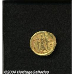 <B>Anastasius I.</B></I> A.D. 491-518. AV solidus (21 mm, 4.42 g). Constantinople, A.D. 491-498. Helmeted and cuirassed bust facing slightly right, holding spear over shoulder and shield decorated with horseman spearing a fallen enemy; helmet decorated with a small cross / Victory standing left, holding long voided cross; star in right field; (Delta)/CONOB. DOC 4 var. (officina not listed); SB 3. Near VF. <BR><I>From the Geneva Collection.</B></I> <BR><BR><B>Important notice:</B> Heritage usually auctions material at the rate of 200-250 lots per hour. On some occasions eBay Live bid software or the Internet may not be able to keep up with the pace of the auction. We recommend placing a realistic absentee bid now as insurance to avoid disappointment. Occasionally the auctioneer may eliminate or reject an eBay Live bid, and the auctioneer may also reopen a lot after the close of the eBay live bidding (usually because we missed an audience bid), and may reject your bid even if it shows you as the winning bidder. By bidding via eBay Live, you agree that Heritage may award the lot to another bidder at its sole discretion under the circumstances described above or any other reasonable circumstances. Since eBay bids are not shown to us until we open the lot on the floor, we treat those bids just like floor bids. In most cases the floor responds before the eBay bid is presented to us, due to Internet lag time, so for consistency we have made it a policy that floor bids are always considered first over tie eBay live bids. Also please note that all Heritage lots purchased through eBay Live carry a 20% Buyer's Premium. Please make sure you read the Terms and Conditions before you bid.