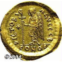 <B>Anastasius I.</B></I> A.D. 491-518. AV solidus (20 mm, 4.35 g). Constantinople, A.D. 498-518. Helmeted and cuirassed bust facing slightly right, holding spear over shoulder and shield decorated with horseman spearing a fallen enemy; helmet decorated with a small cross / Victory standing left, holding long P-headed (retrograde) cross; star in left field; B/CONOB. DOC 7b; SB 5. Lustrous, Good XF. <BR><I>From the Geneva Collection.</B></I> <BR><BR><B>Important notice:</B> Heritage usually auctions material at the rate of 200-250 lots per hour. On some occasions eBay Live bid software or the Internet may not be able to keep up with the pace of the auction. We recommend placing a realistic absentee bid now as insurance to avoid disappointment. Occasionally the auctioneer may eliminate or reject an eBay Live bid, and the auctioneer may also reopen a lot after the close of the eBay live bidding (usually because we missed an audience bid), and may reject your bid even if it shows you as the winning bidder. By bidding via eBay Live, you agree that Heritage may award the lot to another bidder at its sole discretion under the circumstances described above or any other reasonable circumstances. Since eBay bids are not shown to us until we open the lot on the floor, we treat those bids just like floor bids. In most cases the floor responds before the eBay bid is presented to us, due to Internet lag time, so for consistency we have made it a policy that floor bids are always considered first over tie eBay live bids. Also please note that all Heritage lots purchased through eBay Live carry a 20% Buyer's Premium. Please make sure you read the Terms and Conditions before you bid.