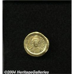 <B>Anastasius I.</B></I> A.D. 491-518. AV solidus (20 mm, 4.35 g). Constantinople, A.D. 498-518. Helmeted and cuirassed bust facing slightly right, holding spear over shoulder and shield decorated with horseman spearing a fallen enemy; helmet decorated with a small cross / Victory standing left, holding long P-headed (retrograde) cross; star in left field; B/CONOB. DOC 7b; SB 5. Lustrous, Good XF. <BR><I>From the Geneva Collection.</B></I> <BR><BR><B>Important notice:</B> Heritage usually auctions material at the rate of 200-250 lots per hour. On some occasions eBay Live bid software or the Internet may not be able to keep up with the pace of the auction. We recommend placing a realistic absentee bid now as insurance to avoid disappointment. Occasionally the auctioneer may eliminate or reject an eBay Live bid, and the auctioneer may also reopen a lot after the close of the eBay live bidding (usually because we missed an audience bid), and may reject your bid even if it shows you as the winning bidder. By bidding via eBay Live, you agree that Heritage may award the lot to another bidder at its sole discretion under the circumstances described above or any other reasonable circumstances. Since eBay bids are not shown to us until we open the lot on the floor, we treat those bids just like floor bids. In most cases the floor responds before the eBay bid is presented to us, due to Internet lag time, so for consistency we have made it a policy that floor bids are always considered first over tie eBay live bids. Also please note that all Heritage lots purchased through eBay Live carry a 20% Buyer's Premium. Please make sure you read the Terms and Conditions before you bid.