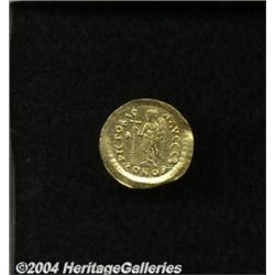 <B>Anastasius I.</B></I> A.D. 491-518. AV solidus (20 mm, 4.35 g). Constantinople, A.D. 498-518. Helmeted and cuirassed bust facing slightly right, holding spear over shoulder and shield decorated with horseman spearing a fallen enemy; helmet decorated with a small cross / Victory standing left, holding long P-headed (retrograde) cross; star in left field; B/CONOB. DOC 7b; SB 5. Lustrous, Good XF. <BR><I>From the Geneva Collection.</B></I> <BR><BR><B>Important notice:</B> Heritage usually auctions material at the rate of 200-250 lots per hour. On some occasions eBay Live bid software or the Internet may not be able to keep up with the pace of the auction. We recommend placing a realistic absentee bid now as insurance to avoid disappointment. Occasionally the auctioneer may eliminate or reject an eBay Live bid, and the auctioneer may also reopen a lot after the close of the eBay live bidding (usually because we missed an audience bid), and may reject your bid even if it shows you as the winning bidder. By bidding via eBay Live, you agree that Heritage may award the lot to another bidder at its sole discretion under the circumstances described above or any other reasonable circumstances. Since eBay bids are not shown to us until we open the lot on the floor, we treat those bids just like floor bids. In most cases the floor responds before the eBay bid is presented to us, due to Internet lag time, so for consistency we have made it a policy that floor bids are always considered first over tie eBay live bids. Also please note that all Heritage lots purchased through eBay Live carry a 20% Buyer's Premium. Please make sure you read the Terms and Conditions before you bid.