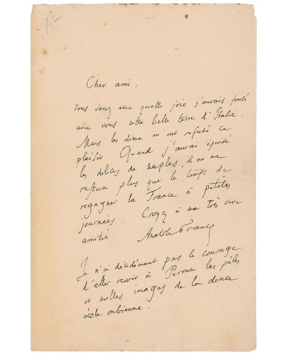 French author (1844–1924) who won the Nobel Prize in Literature in 1921. Untranslated ALS in French, one page, 5.25 x 8.25, no date. Moderate overall creases and wrinkling, and scattered foxing near the top, otherwise fine condition.