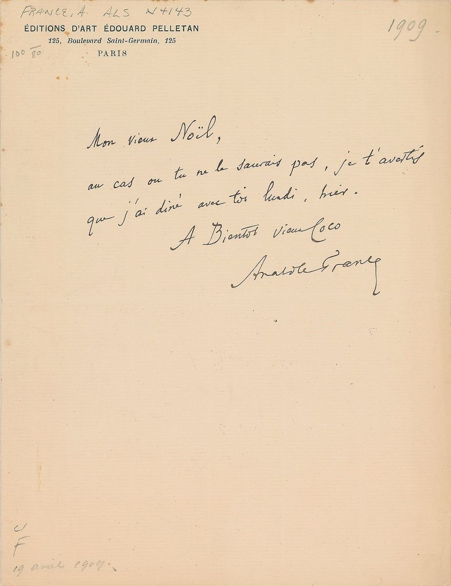 French author (1844–1924) who won the Nobel Prize in Literature in 1921. Untranslated ALS in French, one page, 6 x 7.75, Editions d’Art Edouard Pelletan letterhead, no date but annotated April 18, 1909 in pencil. In fine condition.