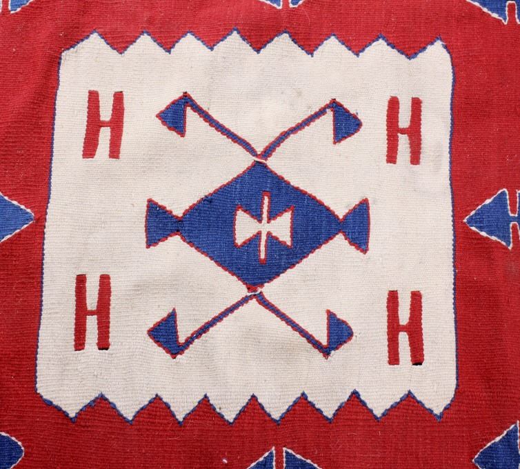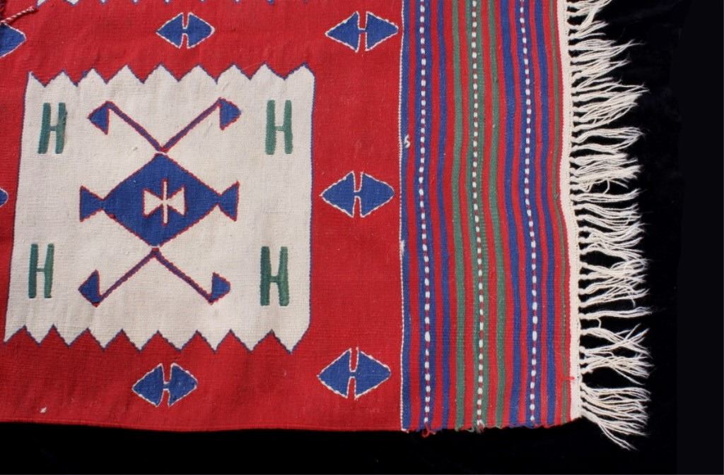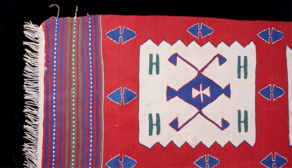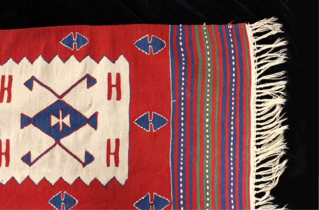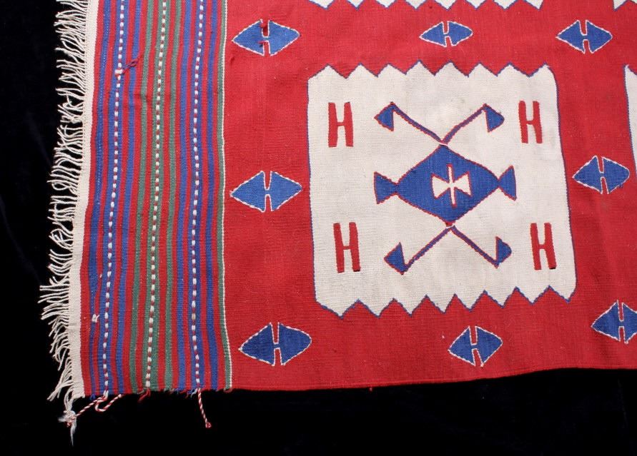 Available for your bidding pleasure is this Anatolian Ateri Kilim Rug originating from the Caucasus Mountains from the 1900's. Rug weaving in Anatolia first began with the arrival of the Turkish tribes from Central Asia who settled in this region. Therefore, Anatolian rugs form a branch of ethnic Turkish rugs. This wonderful rug displays a vibrant red with excellent attention to detail. The early carpet shows a tight hand woven construction with fringe shown on each end of the rug. The rug displays red, purple, blue and tan with all colors showing vibrantly with no bleeding or fading. This piece is unique and shows excellnt quality and condition. It measures