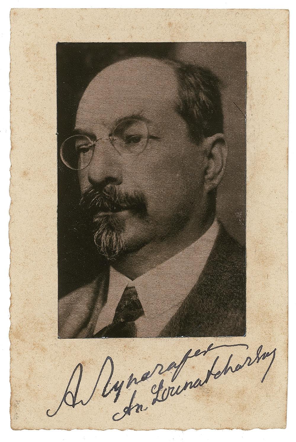 Russian Marxist revolutionary (1875-1933) and the first Soviet People's Commissar of Enlightenment responsible for culture and education. Rare vintage 3.5 x 5.5 photo, signed in the lower border in Russian in black ink. In fine condition, with scattered light toning and foxing to borders and two trimmed edges. Provenance: The Barry Hoffman Collection.