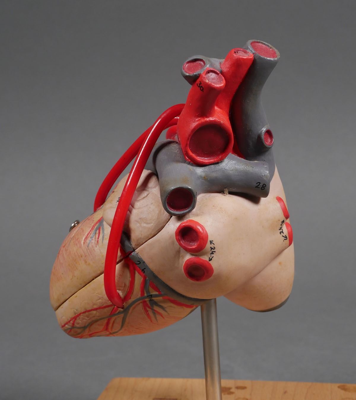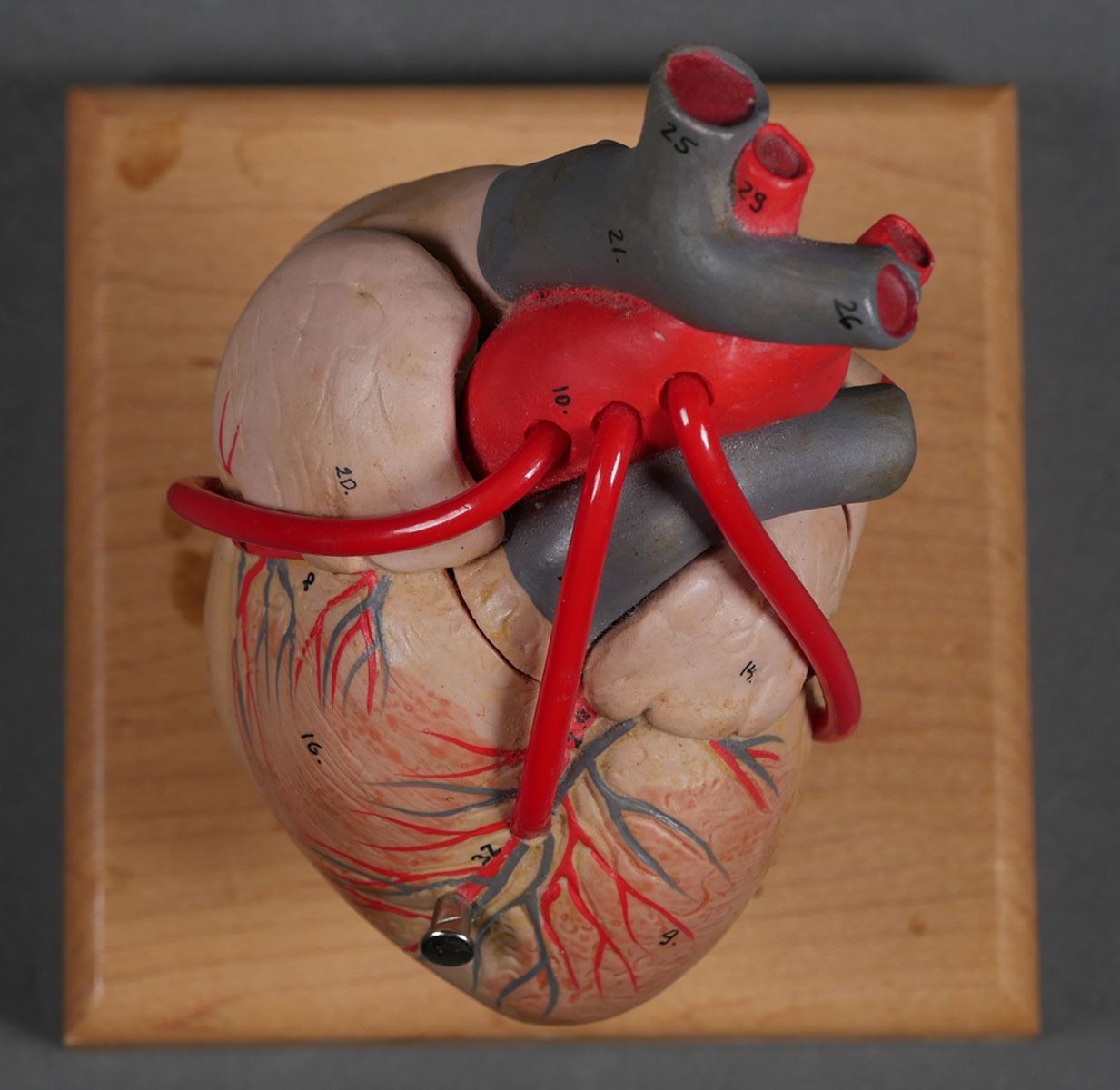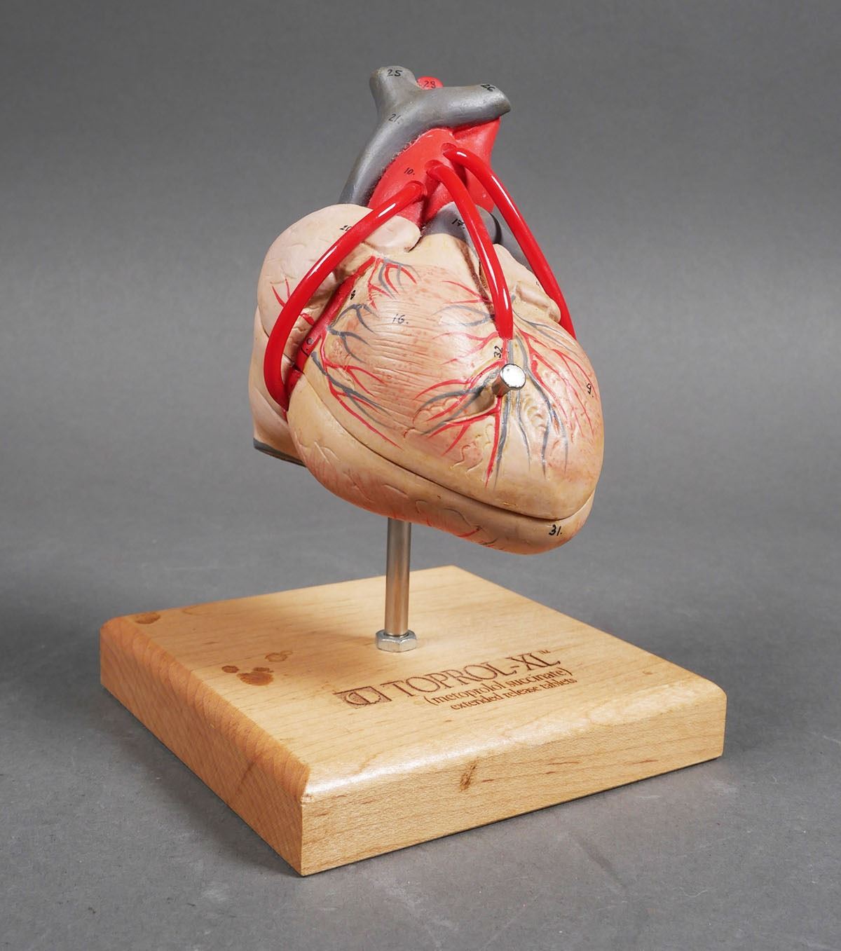 Anatomical model of human heart with removable parts mounted on wood plaque. Heart is approx. 4 1/2" x 3". Model is made of some type of rubber or plastic composite. Plaque has advertisement for Toprol. Total height with plaque is 6 1/2" x 4 1/2" x 4 1/2". Good condition with light wear, appears complete with no missing parts.