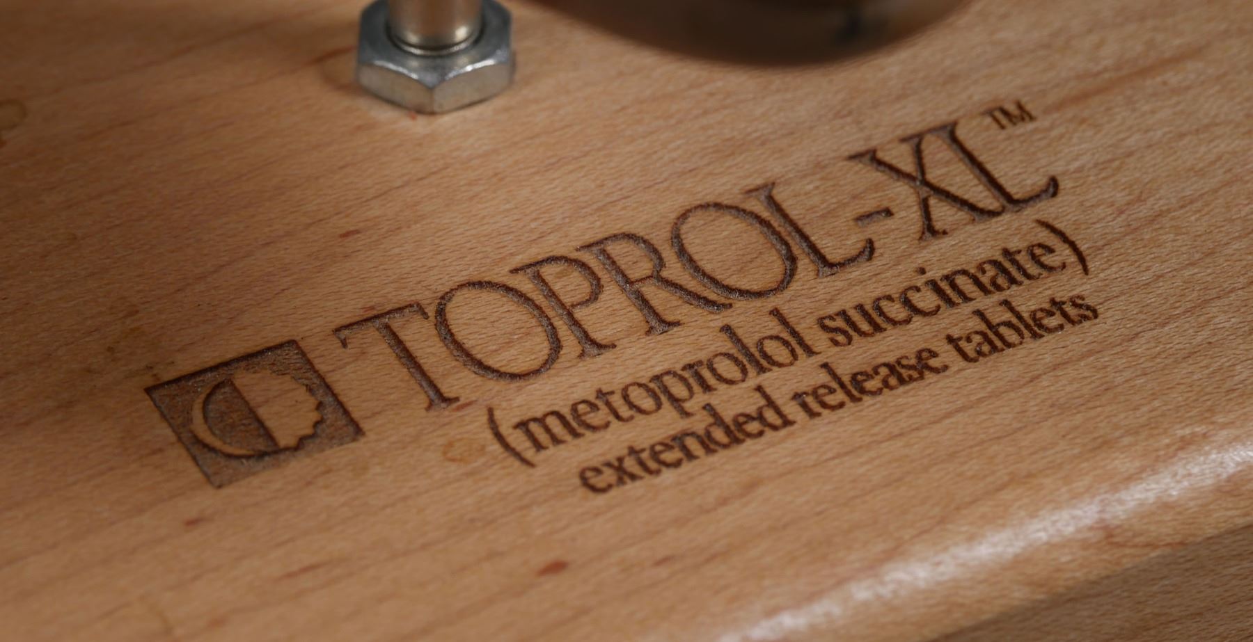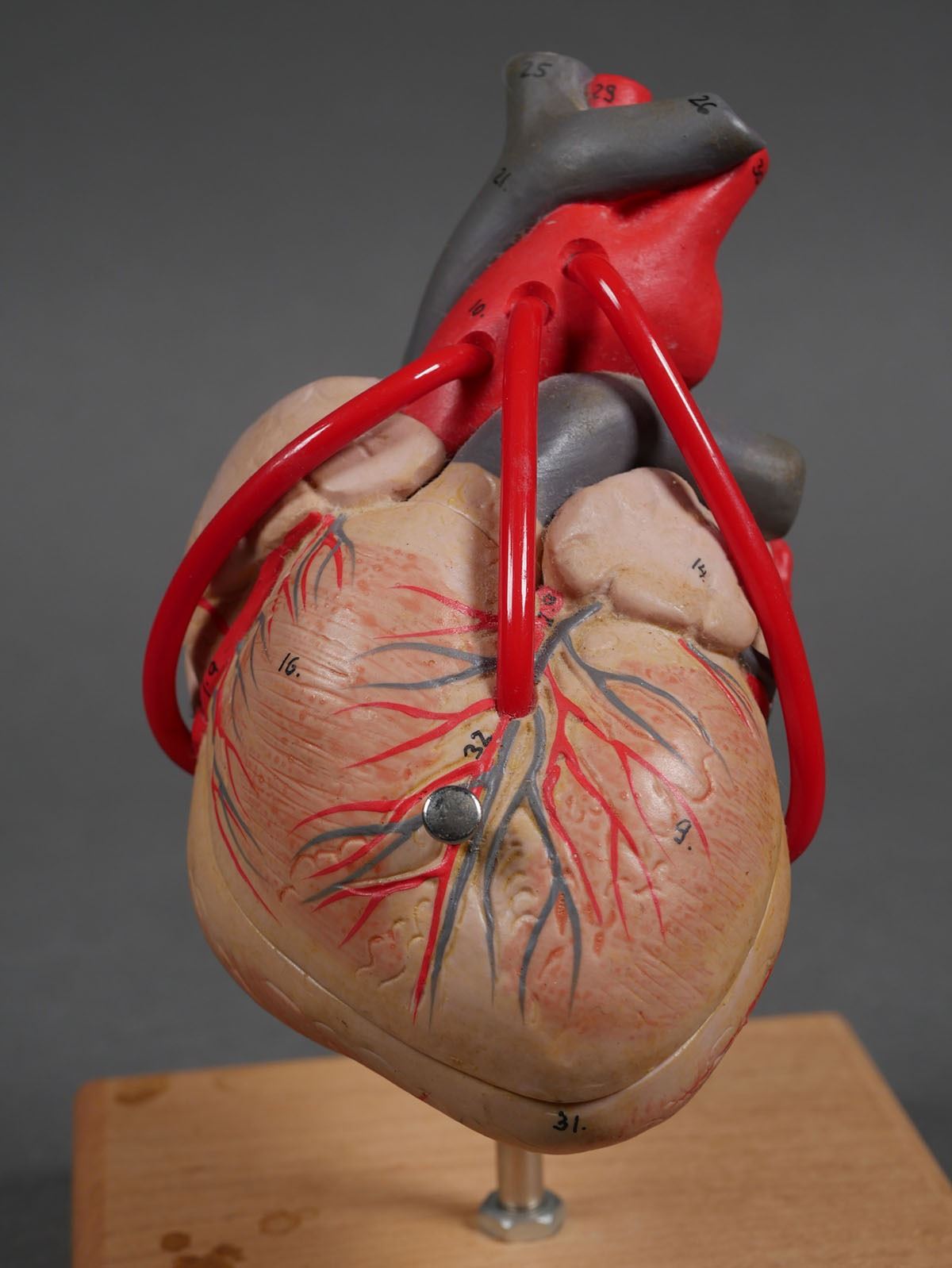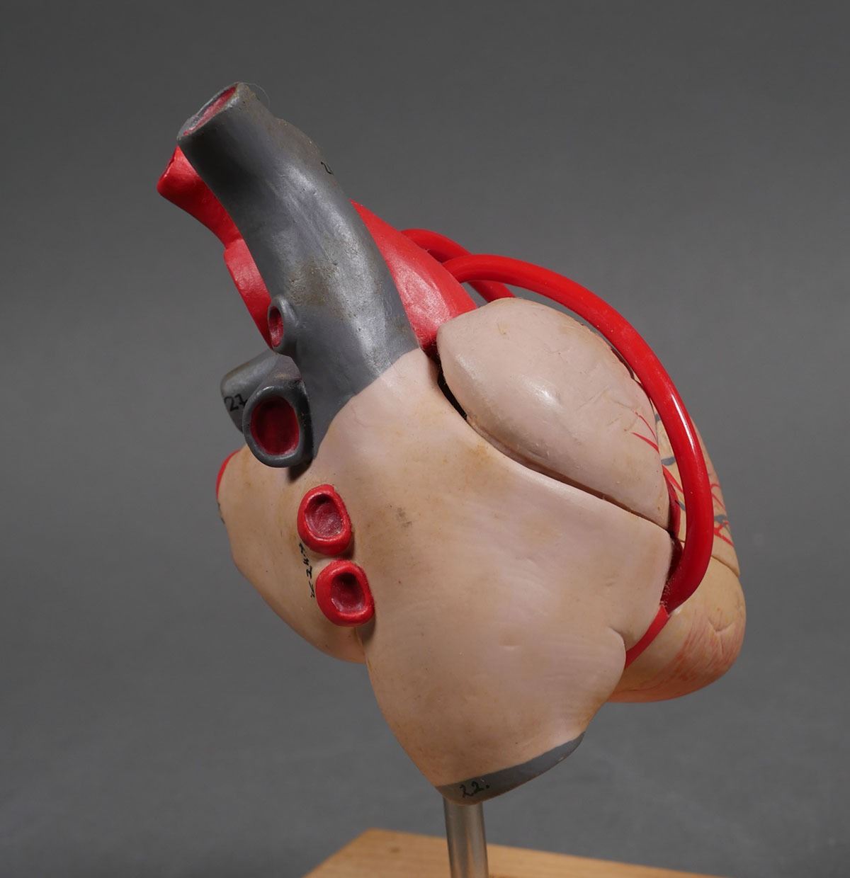 Anatomical model of human heart with removable parts mounted on wood plaque. Heart is approx. 4 1/2" x 3". Model is made of some type of rubber or plastic composite. Plaque has advertisement for Toprol. Total height with plaque is 6 1/2" x 4 1/2" x 4 1/2". Good condition with light wear, appears complete with no missing parts.