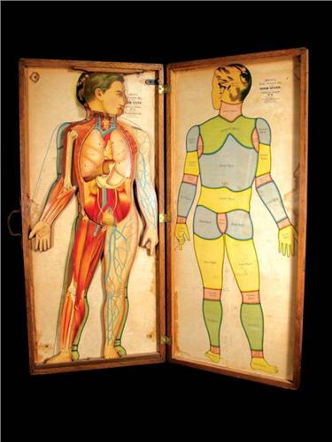 Anatomical Medical Display, American Manikin Co. Peoria, IL. patent 1888. Body parts are tin litho, comes in original wood display case. Minor staining to back ground otherwise excellent original condition. 40 X 45 inches open.