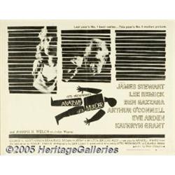 <B>Anatomy of a Murder (Columbia, 1959)</B></I> Half Sheet (22" X 28"). Jimmy Stewart stars as an attorney who defends an army officer accused of murdering a bartender who assaulted his wife. This was one of the most amazing court-room dramas ever filmed, and was highly controversial when the picture was made. George C. Scott was given one of his most notable roles to date when he was cast as the prosecuting attorney. Saul Bass designed this poster as he did most of director Otto Preminger's film posters. This tremendous graphic is reminiscent of the early sixties when this drama of rape and murder was a controversial film. There are the typical fold lines, surface wrinkles, smudge marks and slight edge wear. Fine+.
