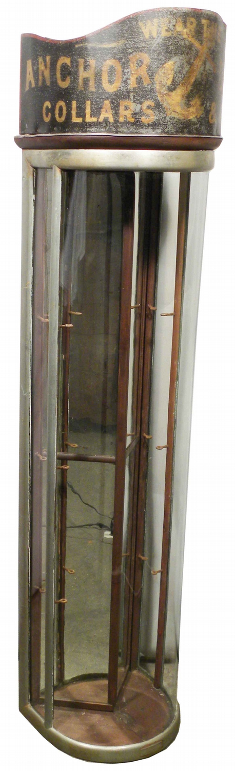 Anchor Brand Collar/Cuff Store Display Case. Nickel with curved glass front, corner mount. Excellent condition, comes with keys. 52 inches tall.
