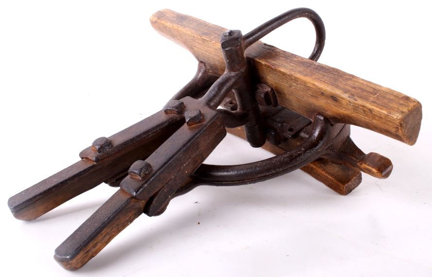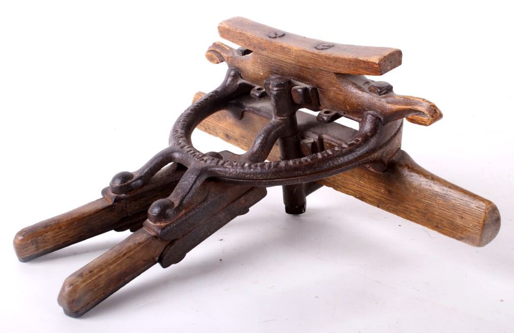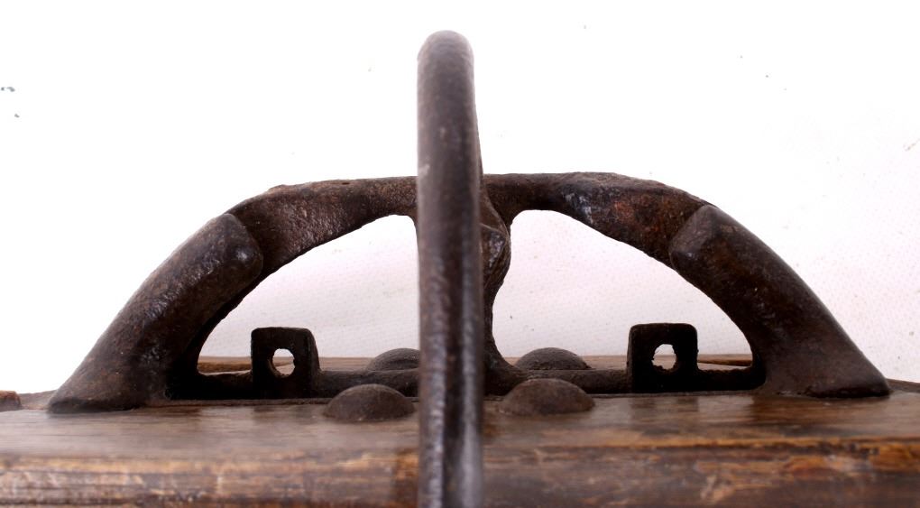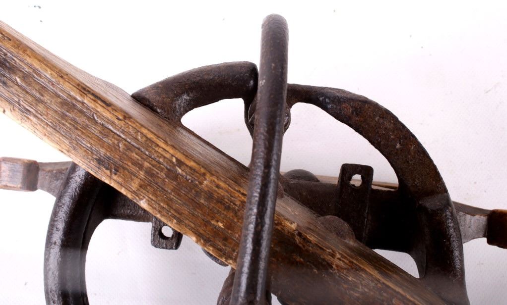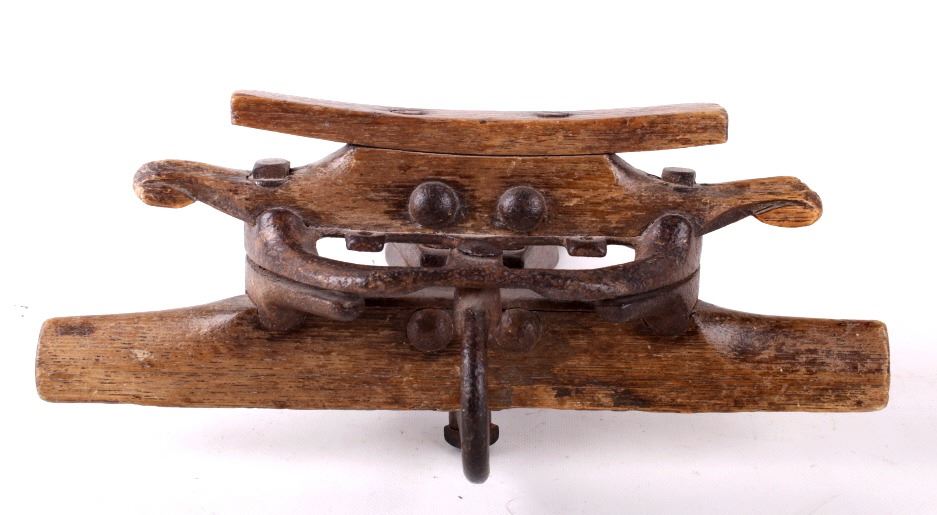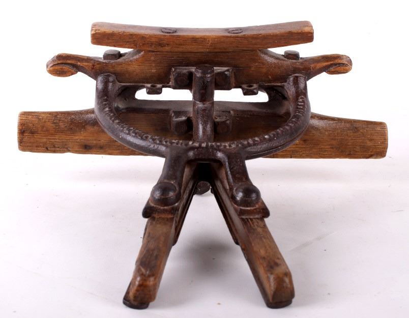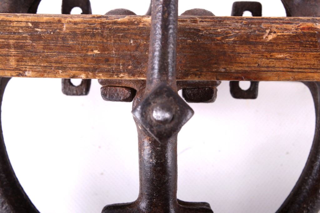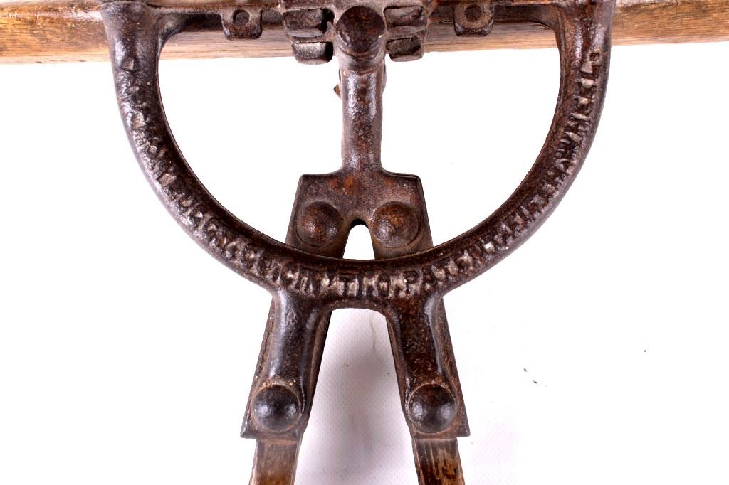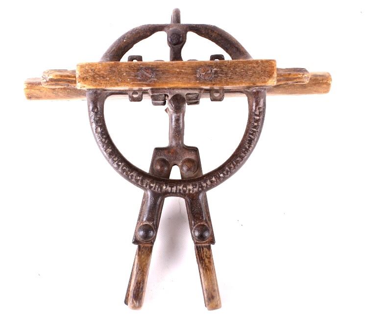 For your consideration is this unique piece of transportation and engineering history, a salesman sample fifth wheel patented by Anchor Buggy Company. The Anchor Buggy Company manufactured horse drawn carriages in Cincinnati, OH from 1886-1917. The company held a number of patents, including this patented fifth wheel and king bolt. The fifth wheel on a buggy was attached to the front axle and allowed the front wheels to turn. The wheel shape in its design gave it its name, fifth wheel. Anchors Buggy Companies improvement to the design added more stability and durability. Contemporary advertisements claimed that the fifth wheel would have to break in five different places before dropping the carriage and endangering the occupants. This piece is in very good condition and is in many ways a beautiful work of 19th Century engineering art. It measures 9.5" x 9.5" x 4"