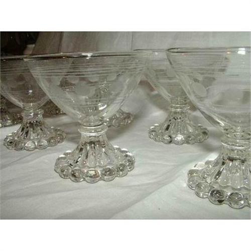 Anchor Hocking crystal pattern number AHC3, Boopie shape with circles and bands. 9 champagnes or sherbets in excellent condition. No nicks, chips, cracks or discoloration.