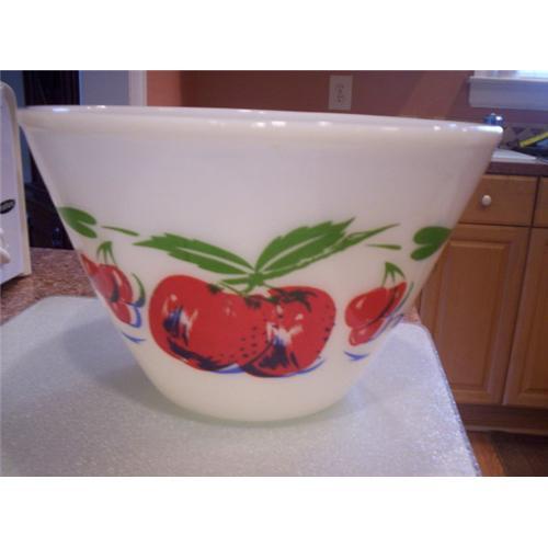 This is a 4 quart milk glass bowl made by Anchor Hocking for their Fire King brand. It's pattern is apples and it's referred to as a splash bowl. It is part of a four bowl set. I believe this is the largest bowl in the set. The colors are bright with very minor wear. Utensil marks are very faint. The apples have only a few specks of paint missing. There are some straw marks in the glass which is a flaw from the factory. This Anchor Hocking apple splash bowl has become a very popular collectible in the Fire King brand of nesting bowls. So if you've been thinking about collecting Fire King or just need a good bowl to use, this apple splash bowl might be the one for you.