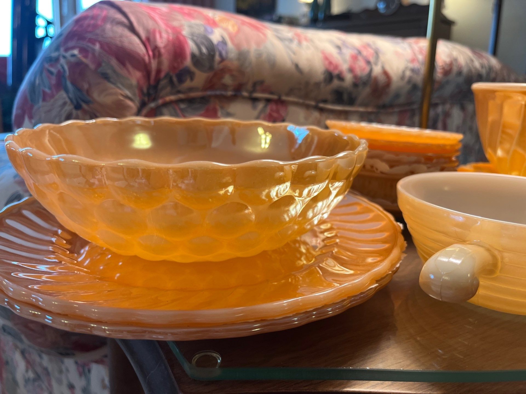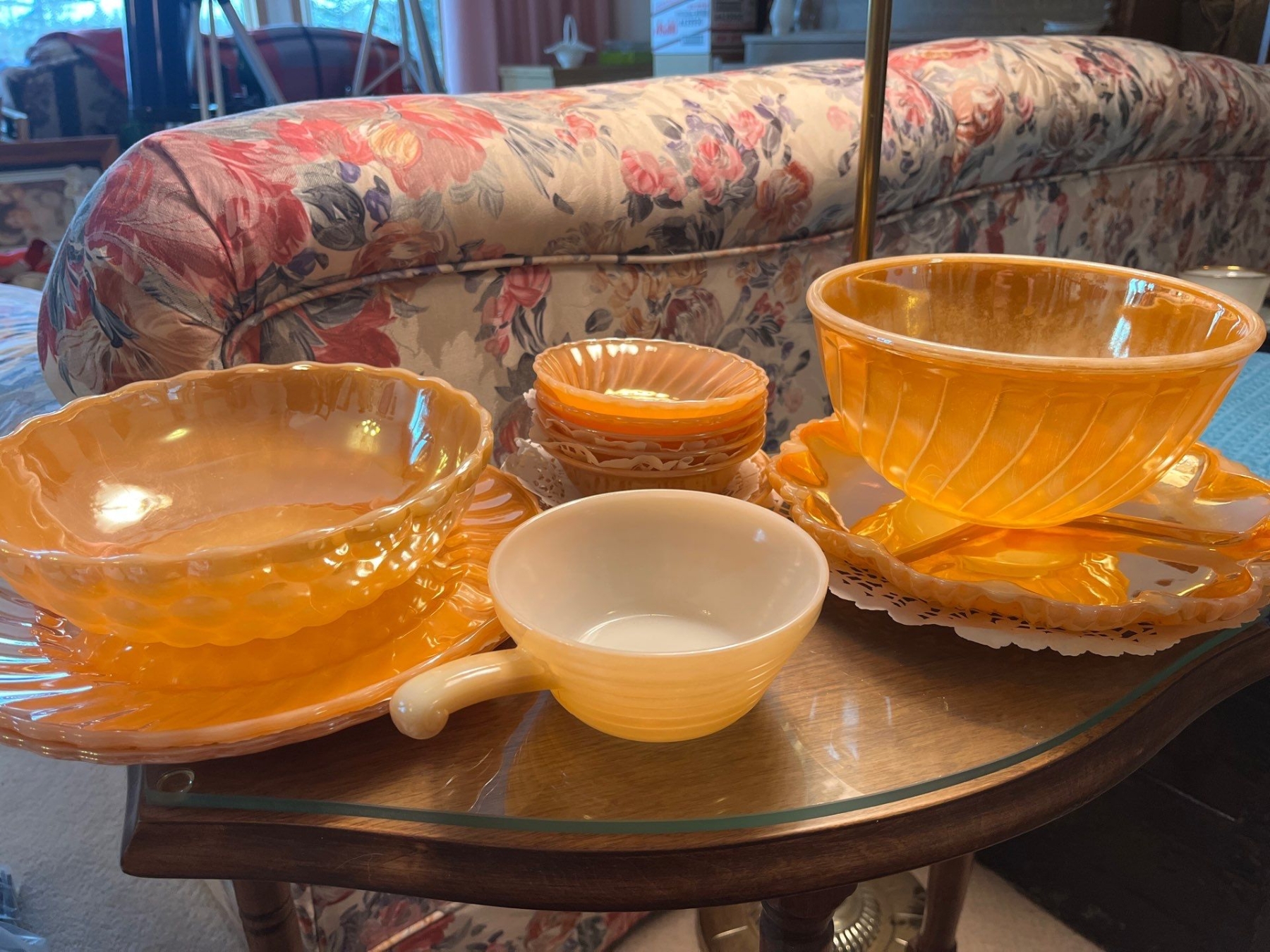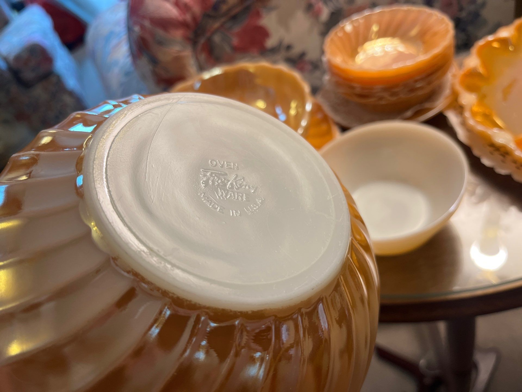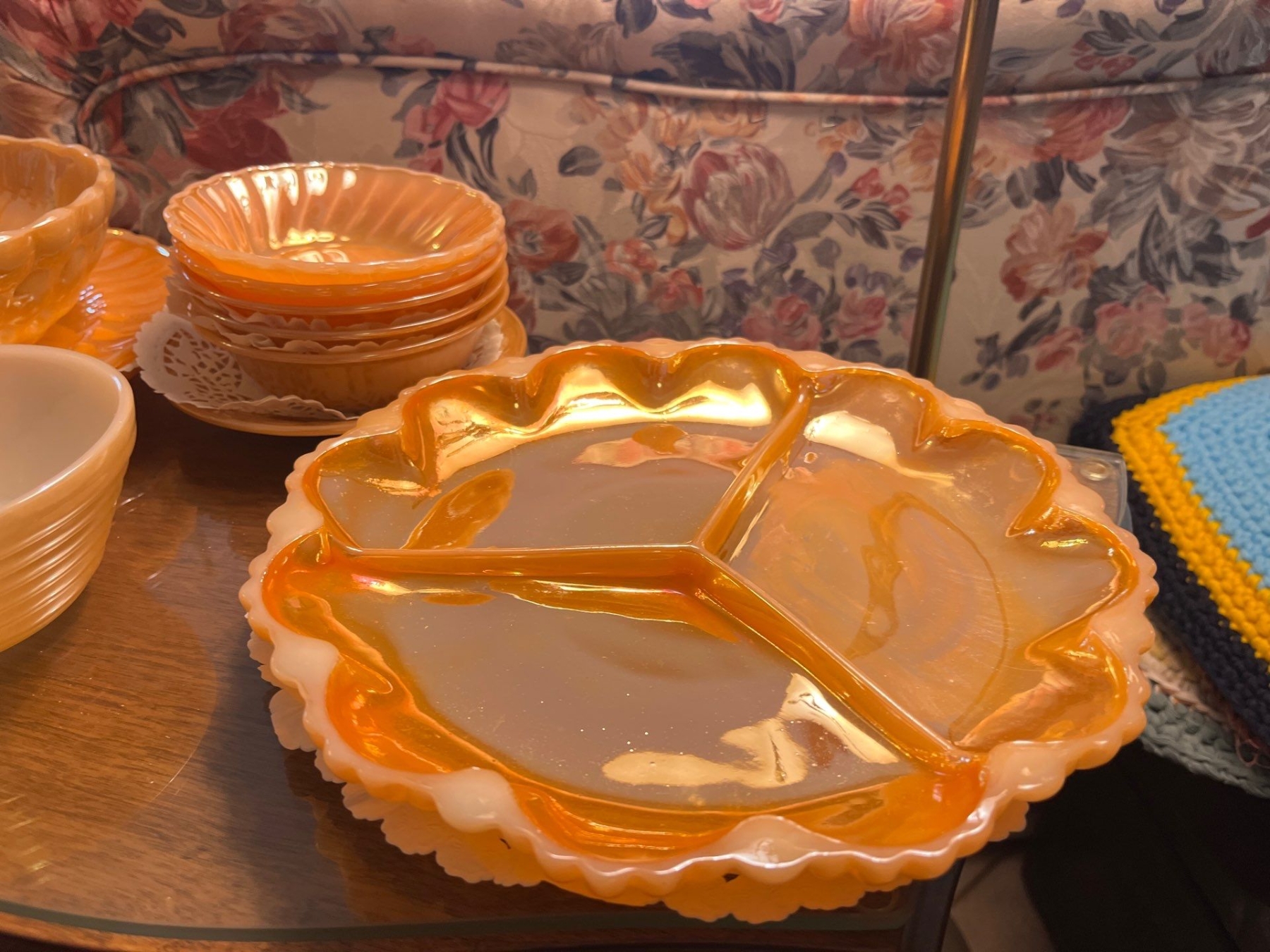 Anchor Hocking Fire-King Peach Lustre 2 serving plates 2 bowls 5 deserts bowls along with Fire king serving bowl and hors d’oeuvres plate
