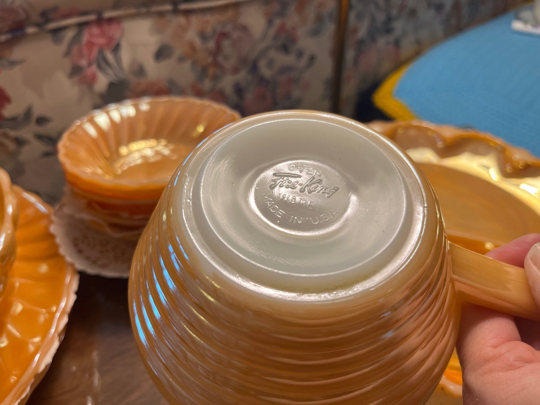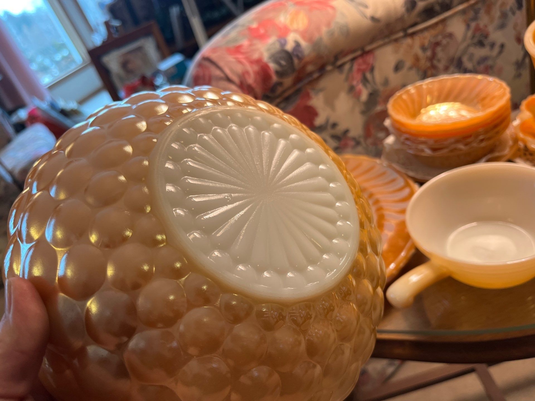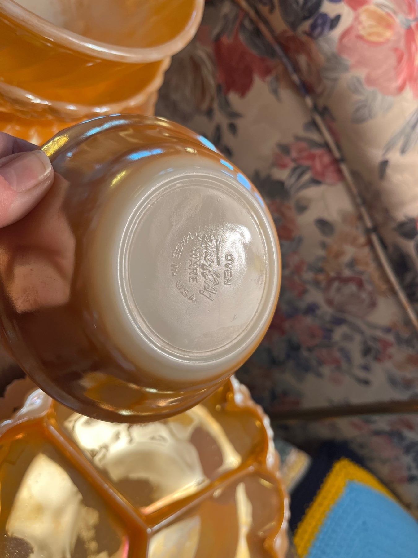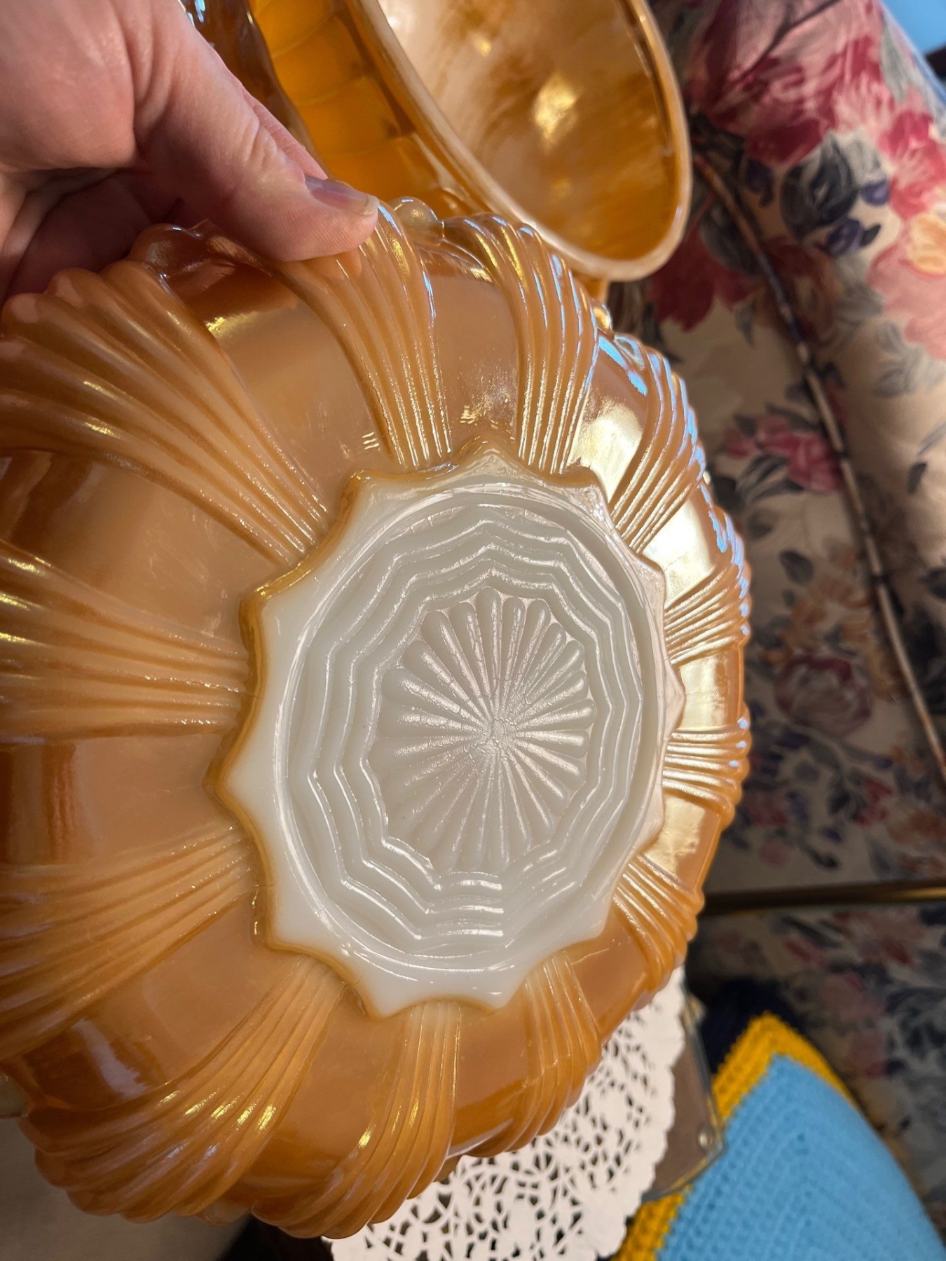 Anchor Hocking Fire-King Peach Lustre 2 serving plates 2 bowls 5 deserts bowls along with Fire king serving bowl and hors d’oeuvres plate