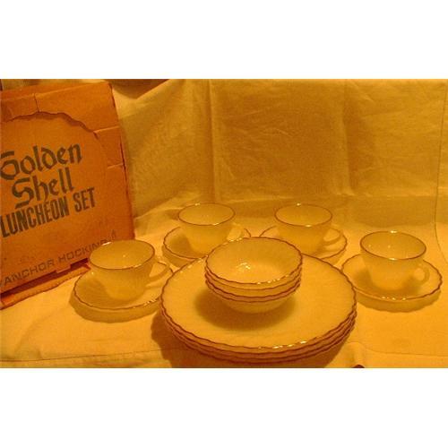 <tr><td>Title:Anchor Hocking Golden Shell 16 Piece Luncheon</td></tr>