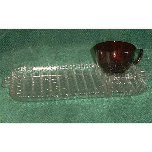 Anchor Hocking Serva Snack, Ruby Red color and Crystal Set, service for 4 in the original box. It looks like it had been stored away in the original packing and looks as if never used. The box reads, Anchor Hocking Glass Corp., Lancaster, Ohio, USA, R200/42 84. One section of the tray is for a cup and one section has a place to rest a cigarette. Excellent condition.