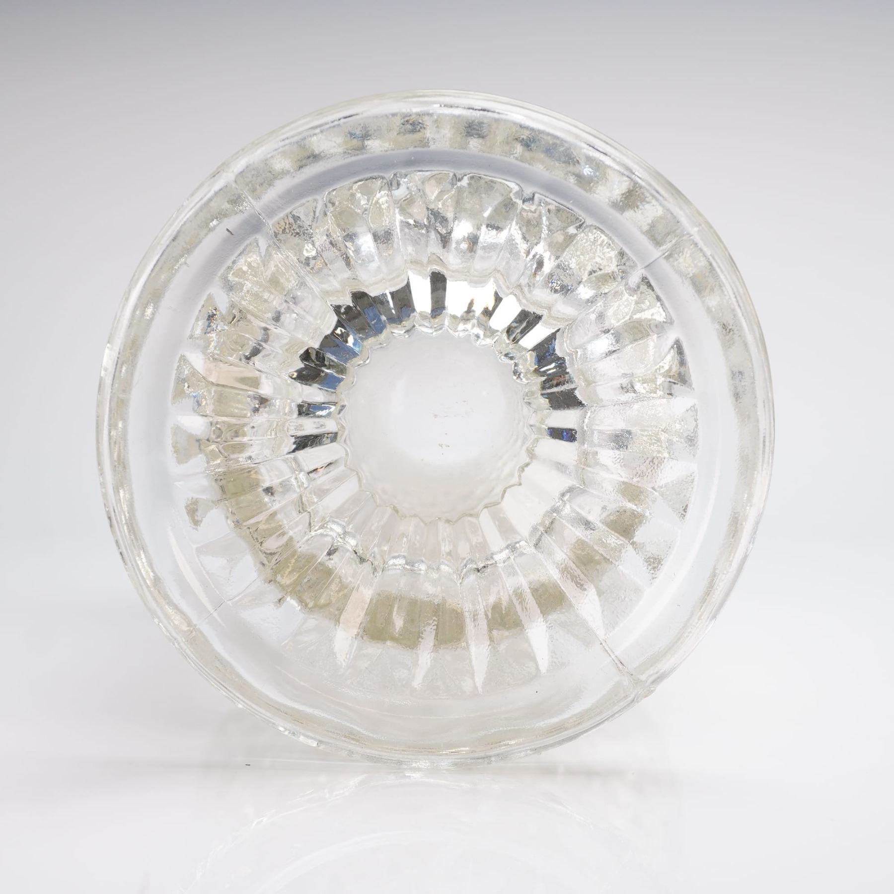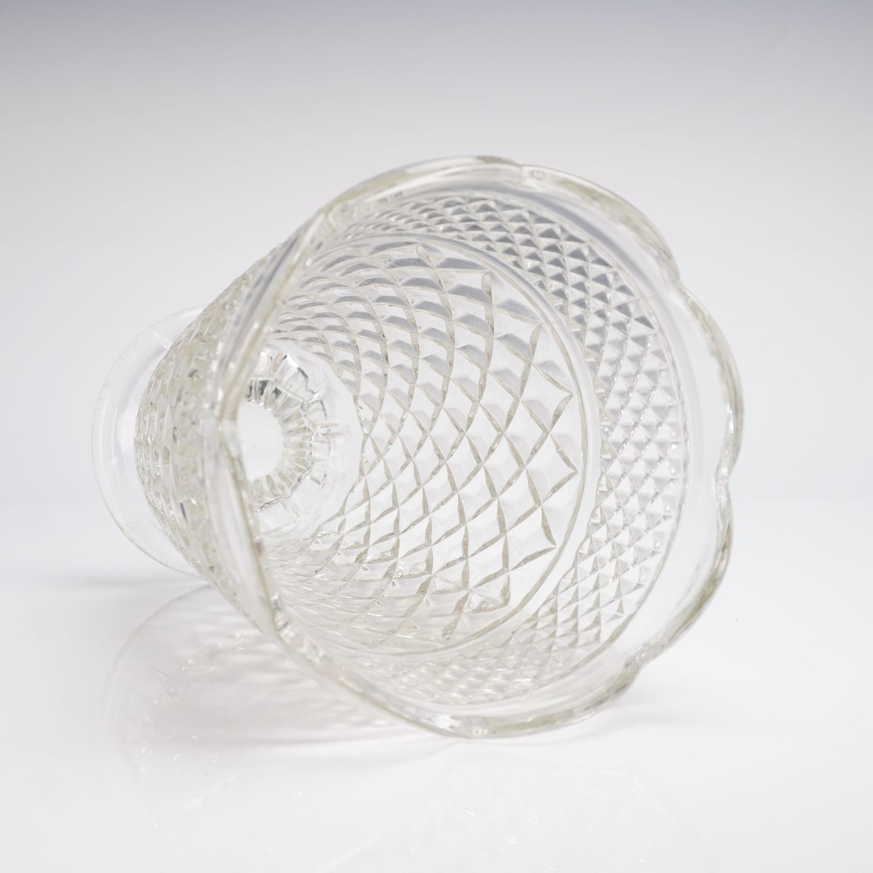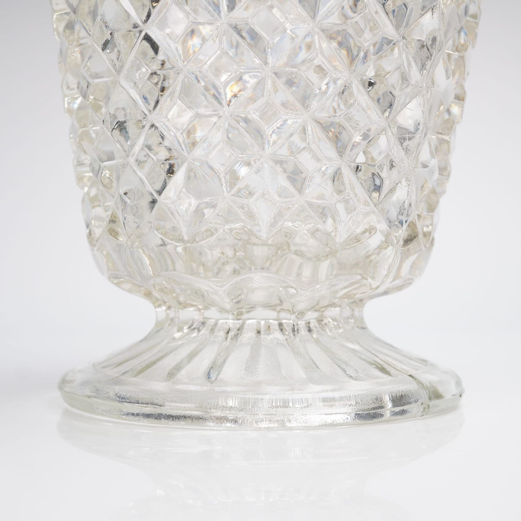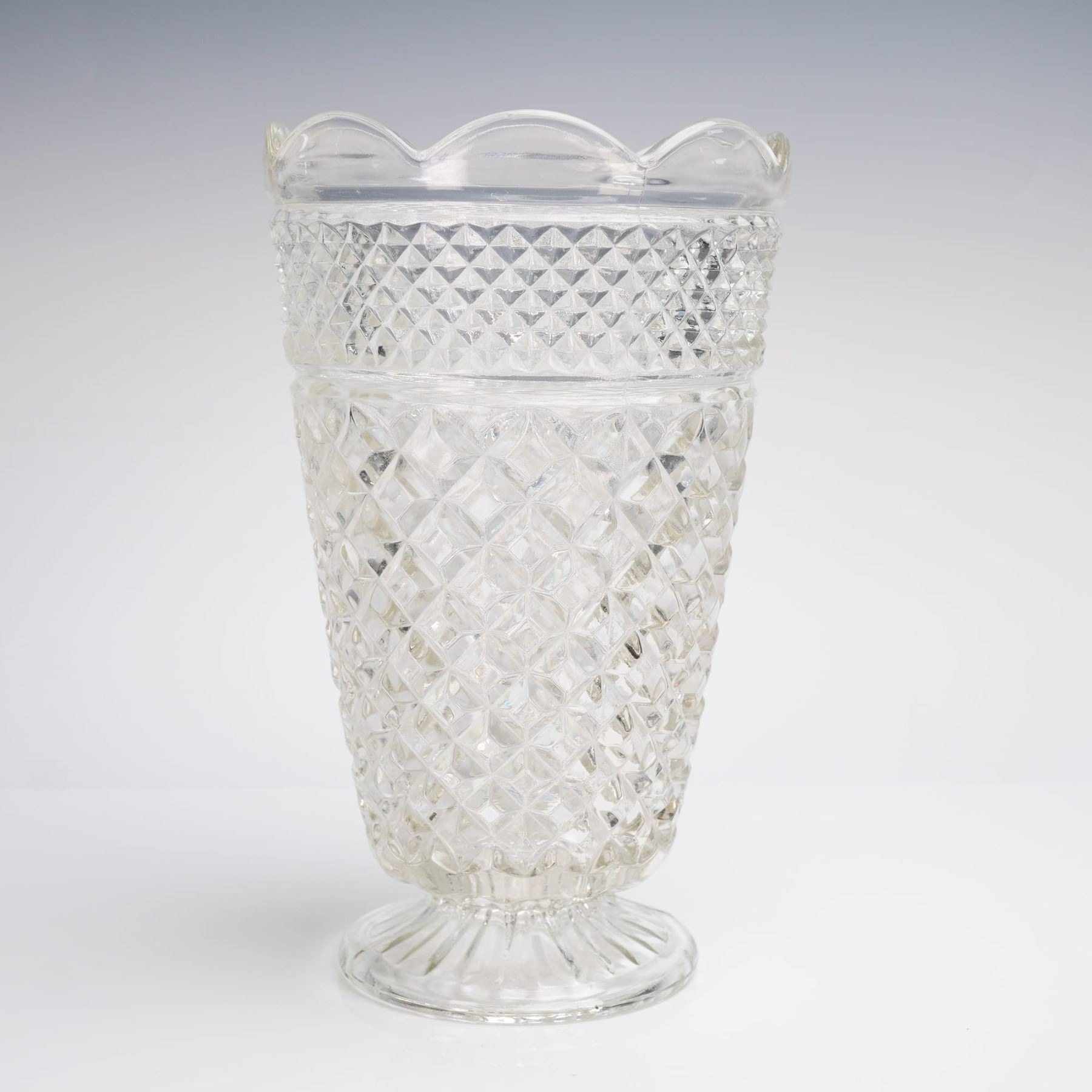 A clear pressed glass vase in the highly recognizable Wexford pattern manufactured by Anchor Hocking. This footed glass vase features a tapered cylindrical body resting on a short, spreading pedestal base. The surface decoration consists of an all-over diamond or quilted design, segmented into distinct horizontal bands. The base is molded with vertical ribbing, and the piece is finished with a wide, scalloped rim. No visible manufacturer's marks are present.