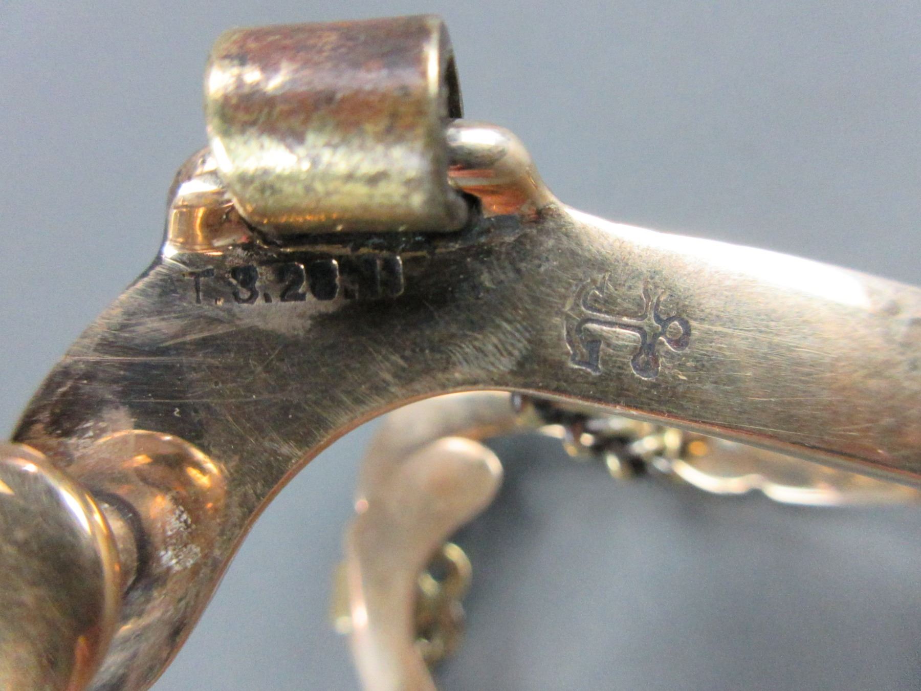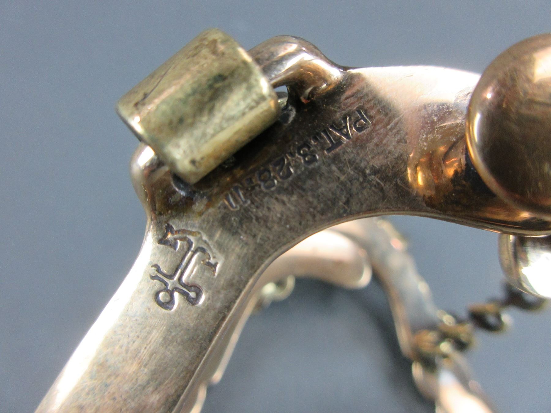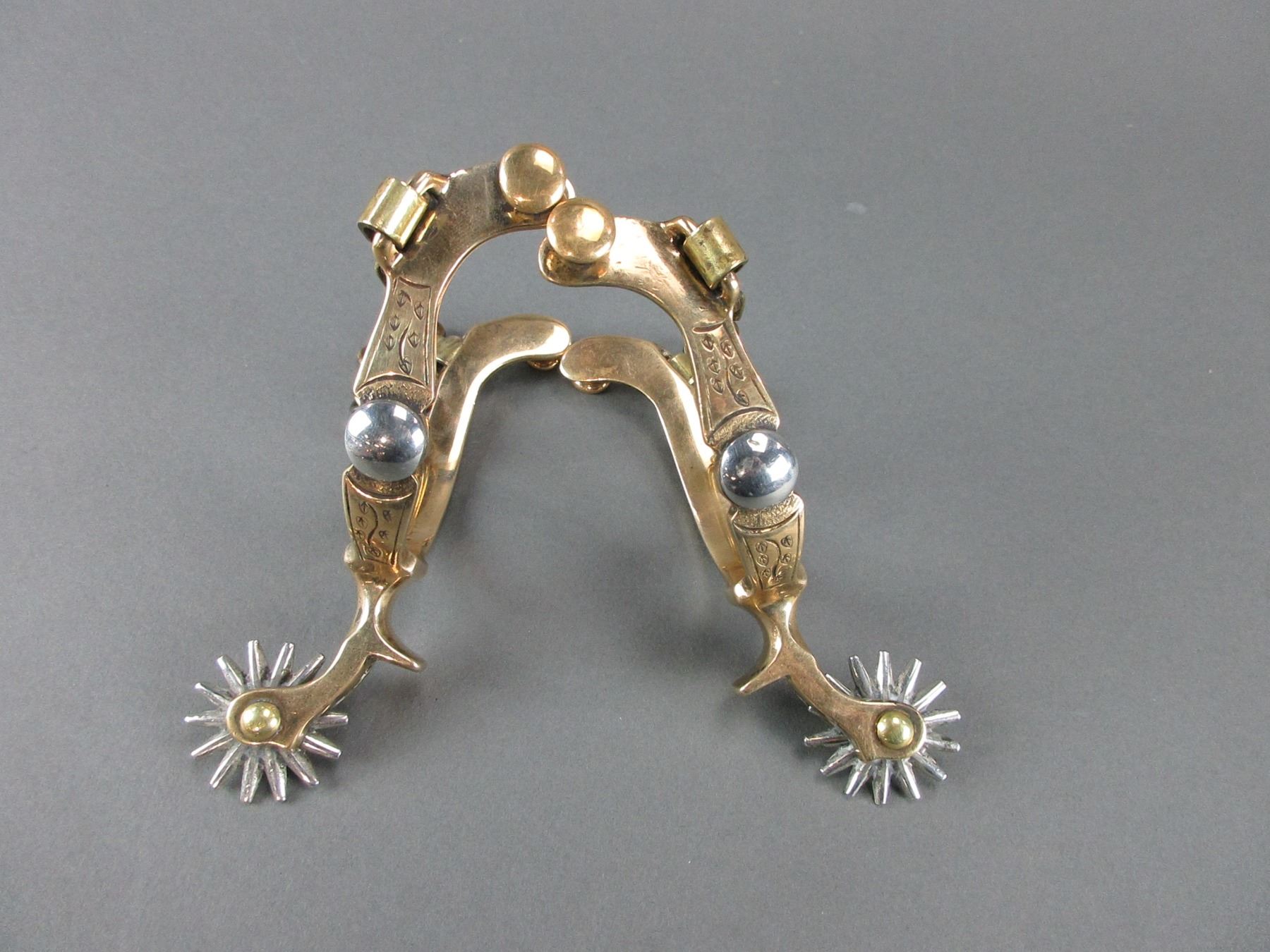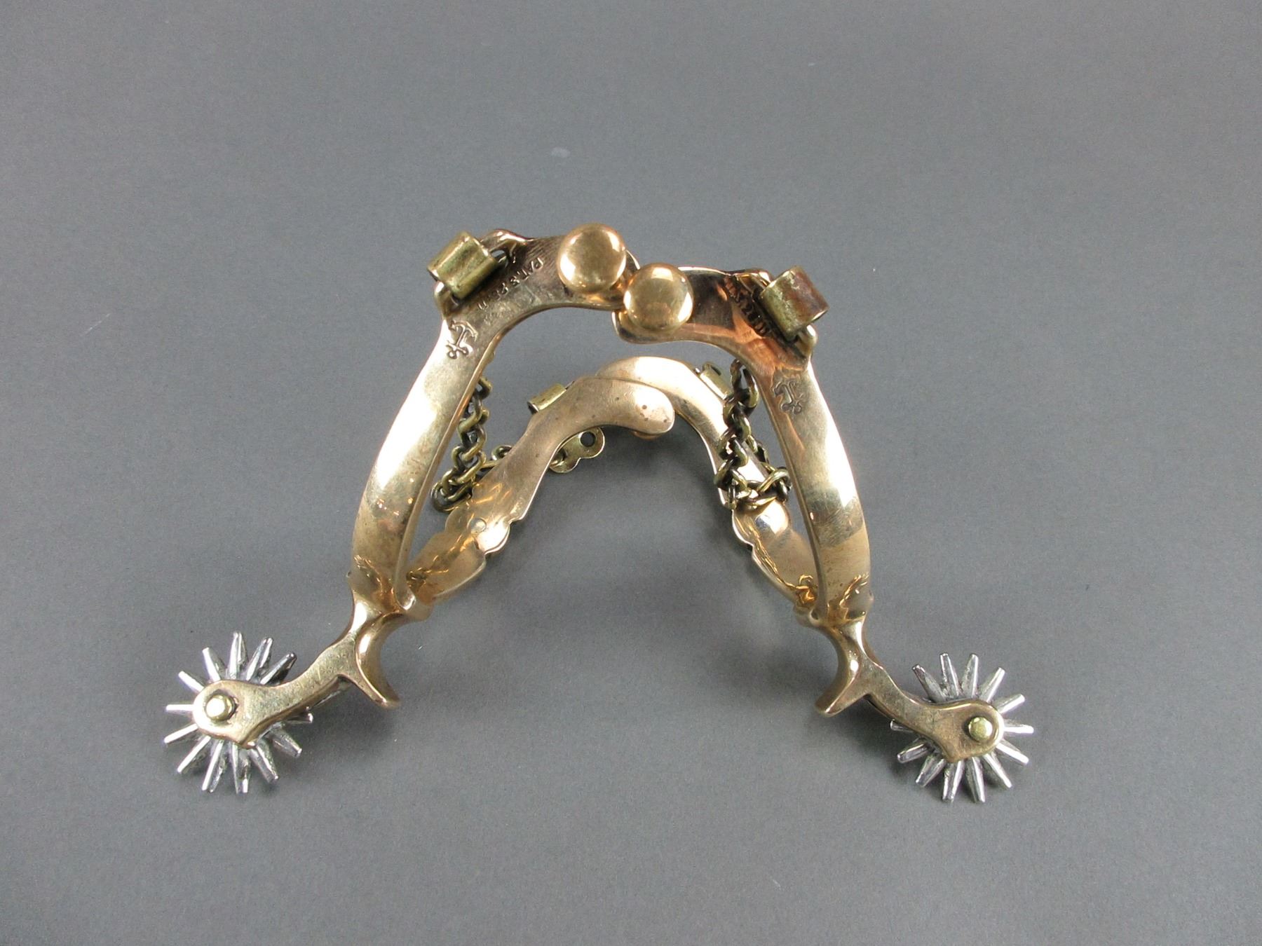 Anchor Marked Hercules Bronze 1 Dot Engraved Spurs With Pat Number- 3-28-11 - .6" Bands- 1.5" Shanks With Chap Guards- 14 Point Rowels- Heel Chains- New Condition